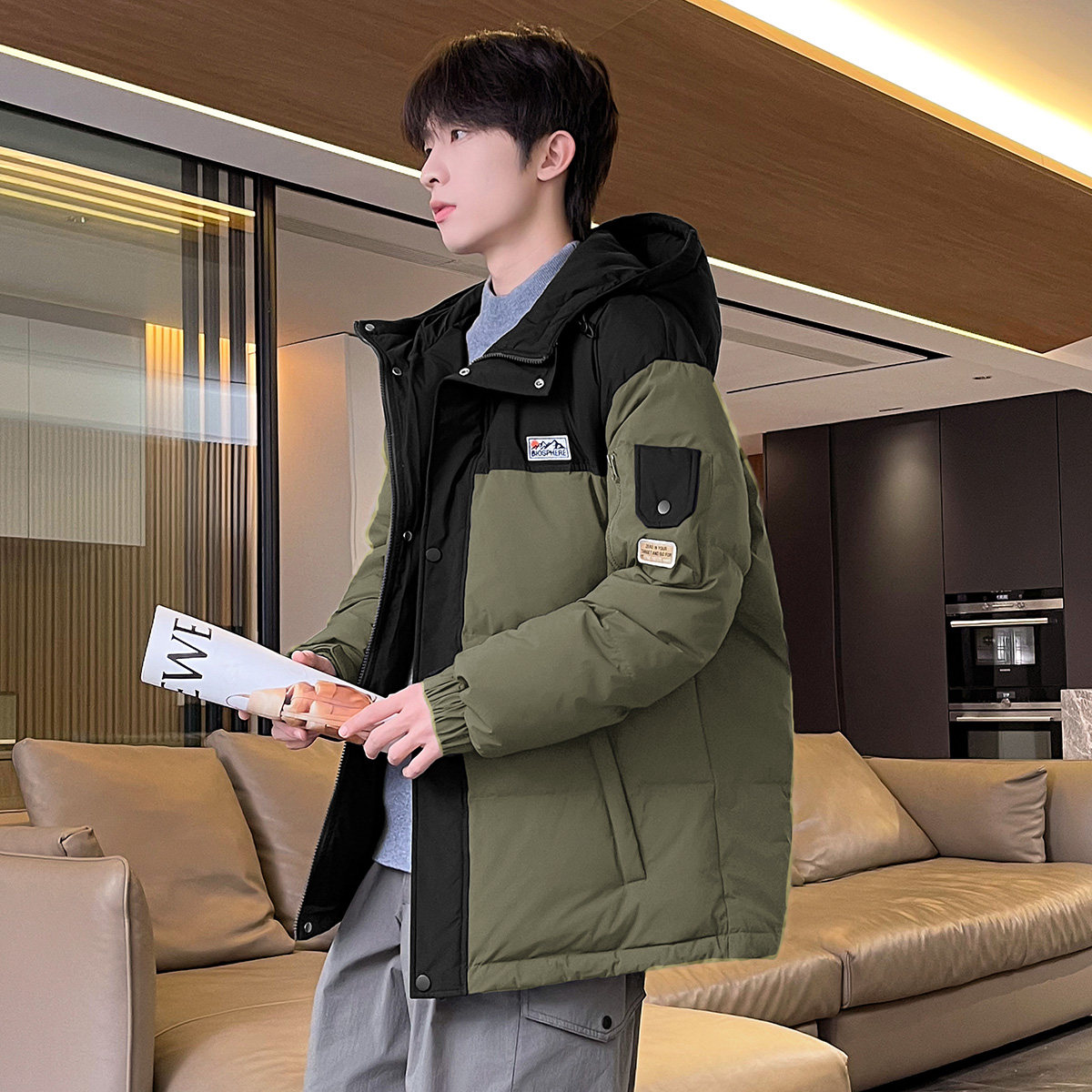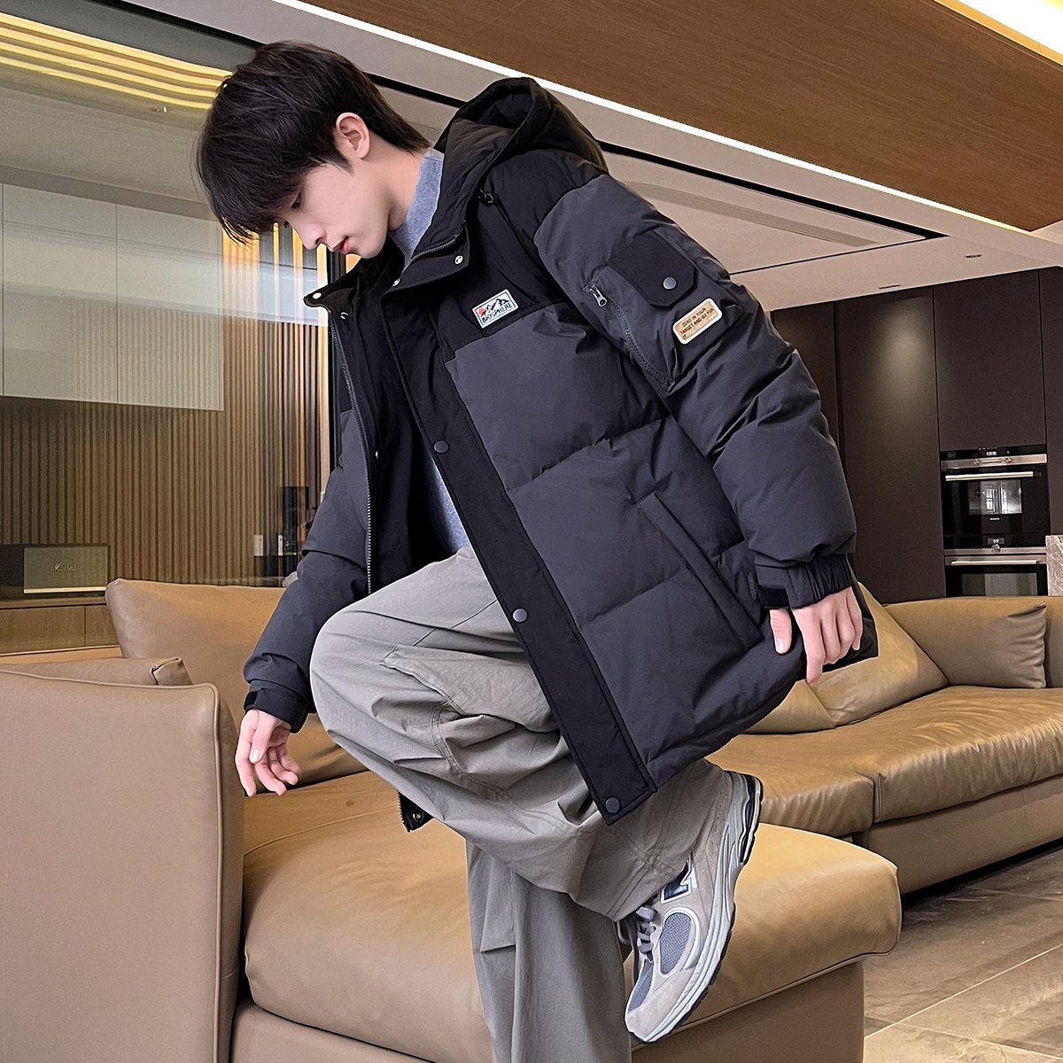 📚 唐狮2024冬季新款男生羽绒服撞色拼接连帽短款面包服青少年韩系潮