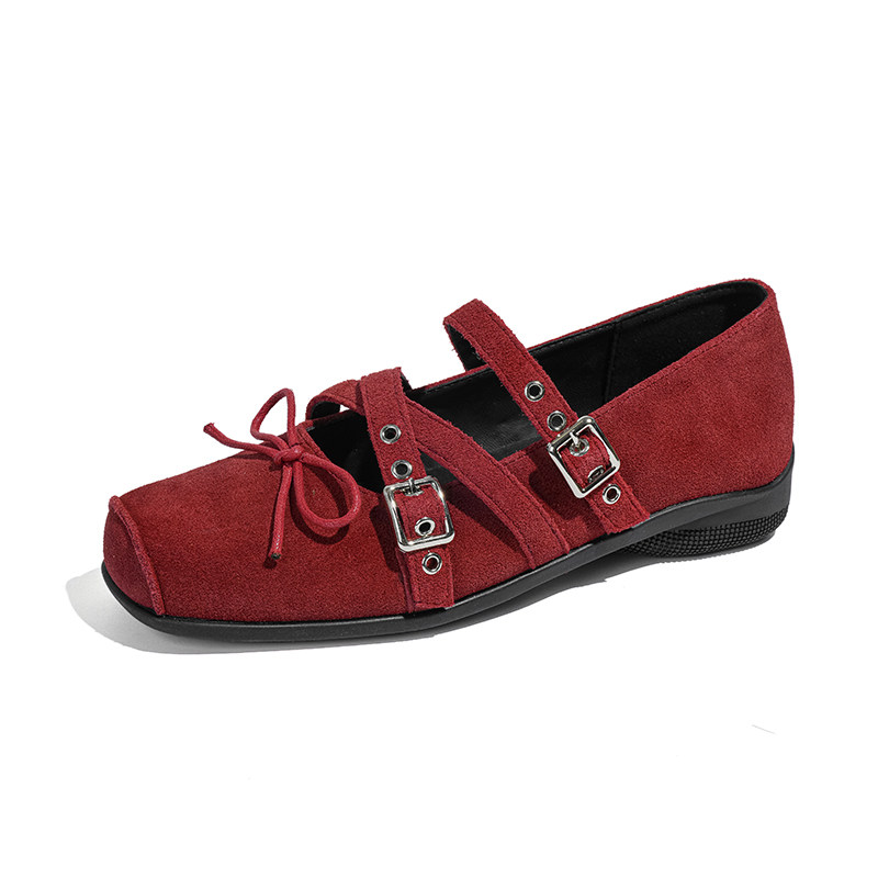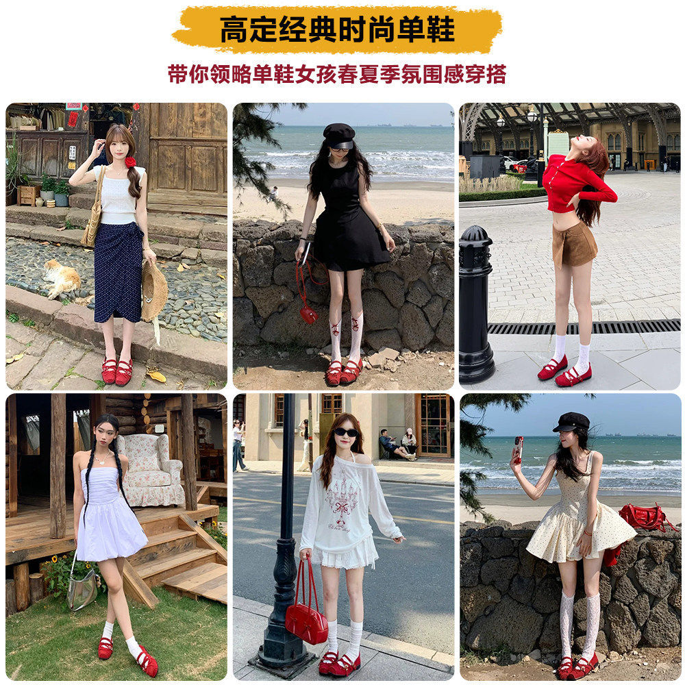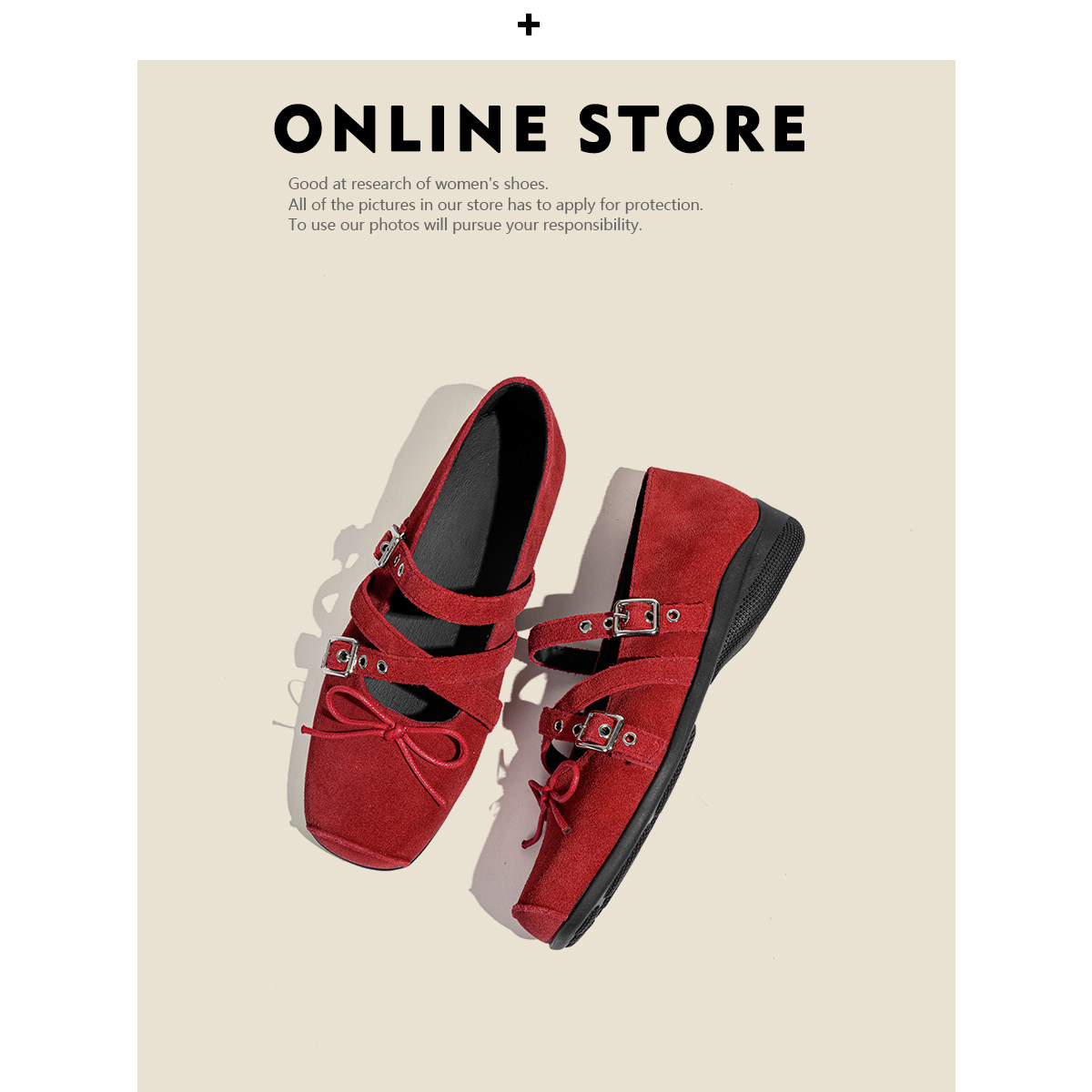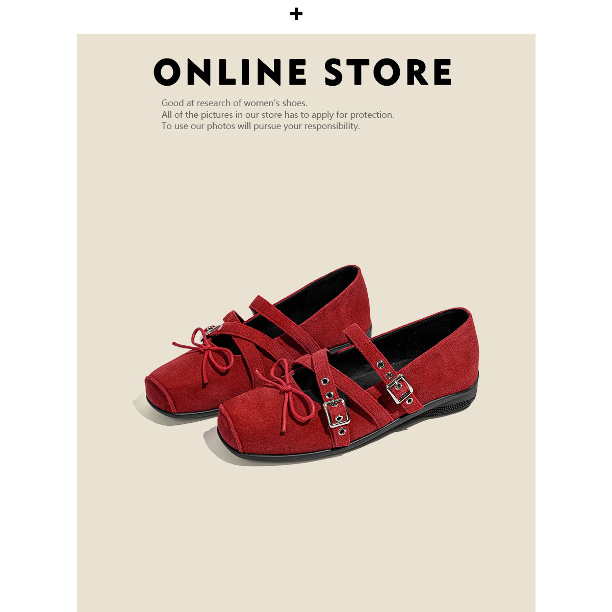📚 真皮版!方头红色芭蕾舞鞋女春季浅口蝴蝶结复古玛丽珍鞋平底单鞋