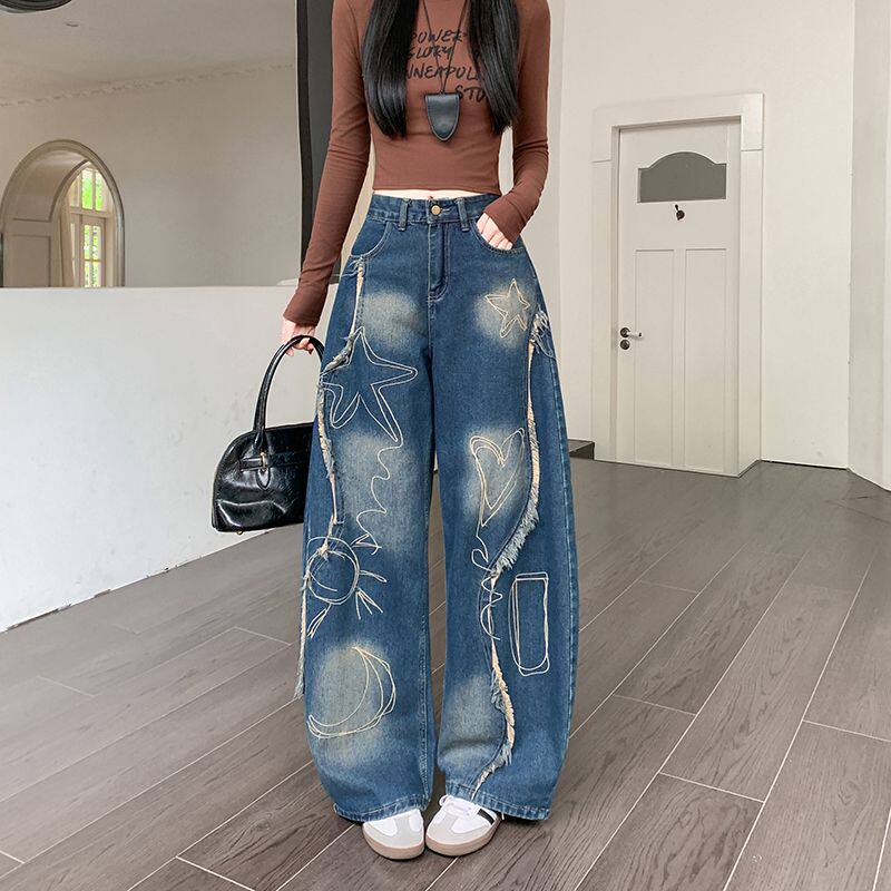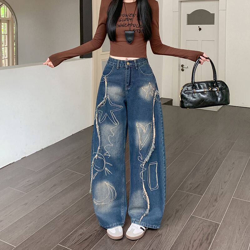📚 美式复古刺绣做旧毛边工装牛仔裤女秋季新款宽松显瘦阔腿裤弯刀裤