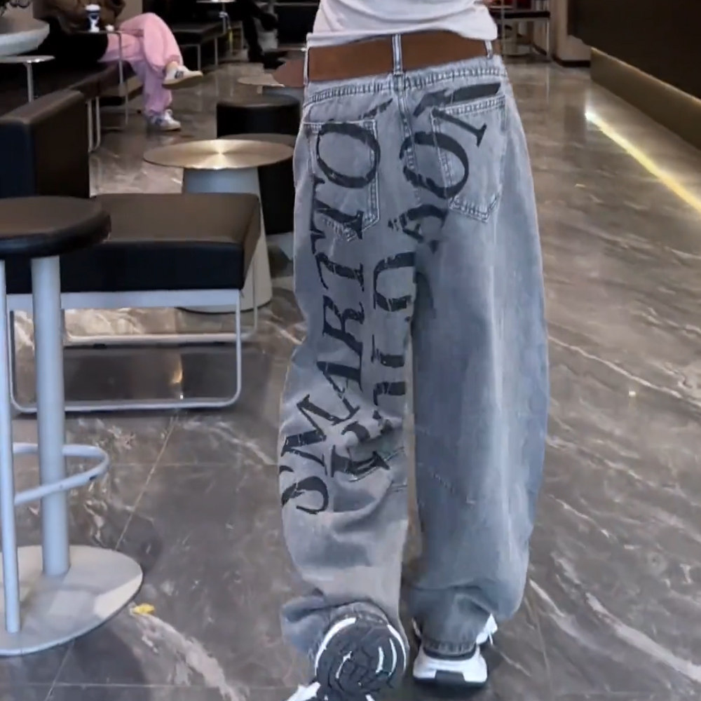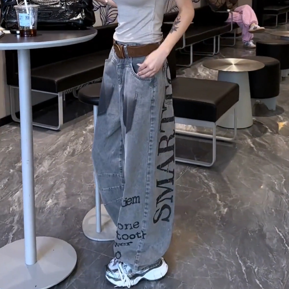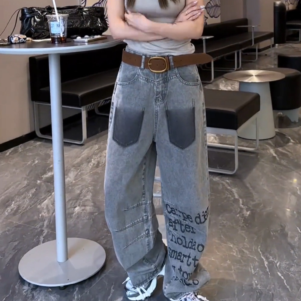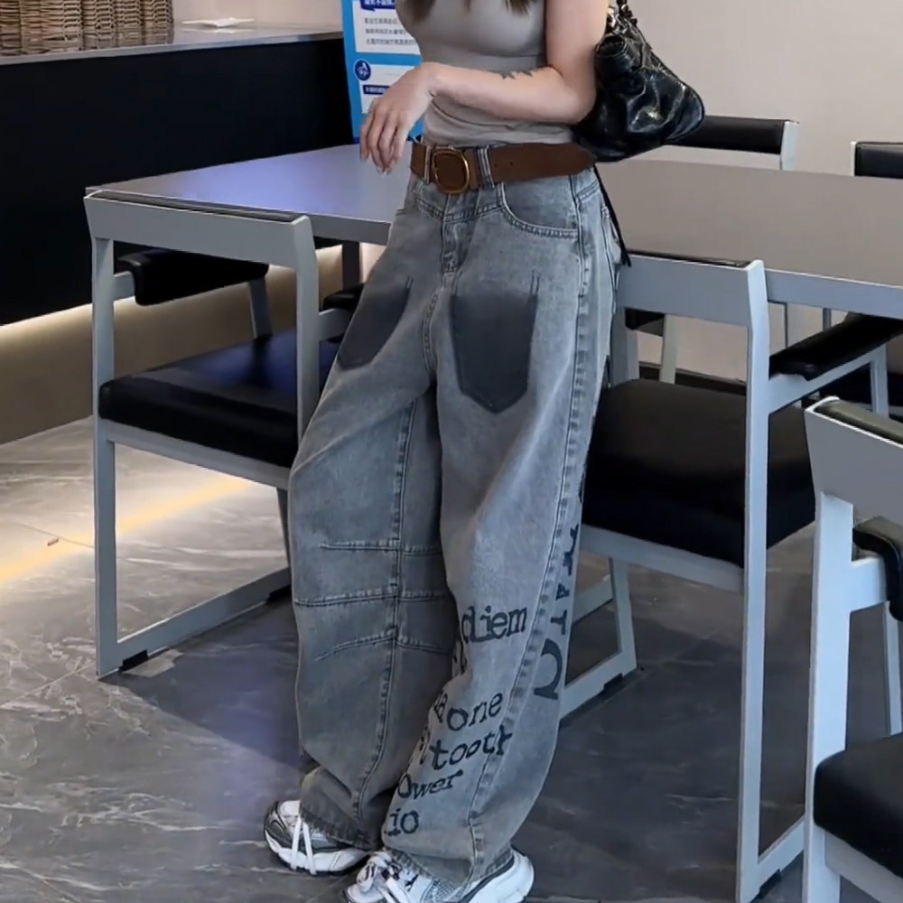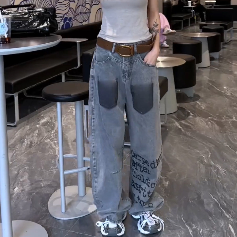 📚 街头风字母印花牛仔裤女秋季新款宽松高腰下拿手百搭阔腿弯刀长裤