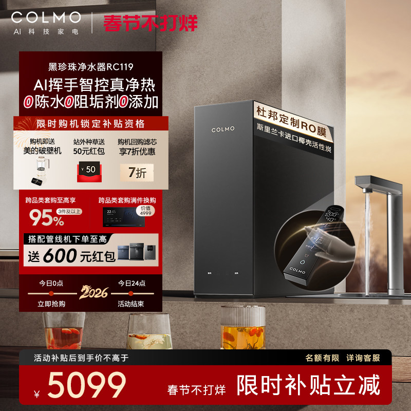 📚 COLMO黑珍珠净热一体机RC119家用净水器厨房0阻垢剂反渗透直饮机