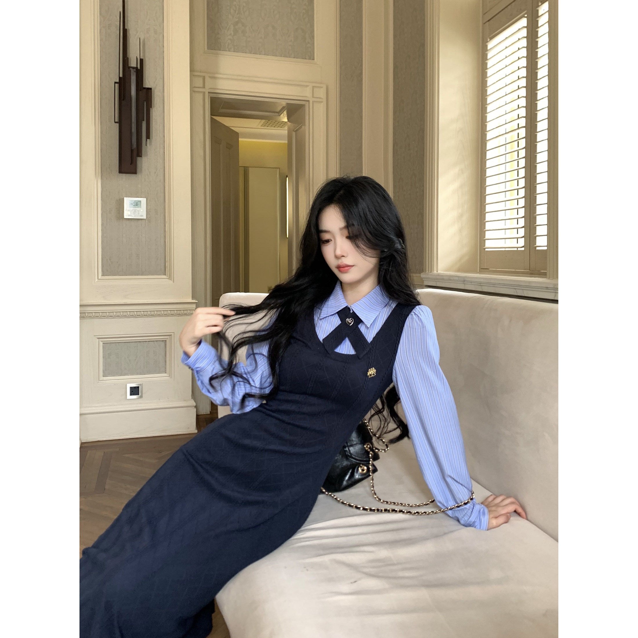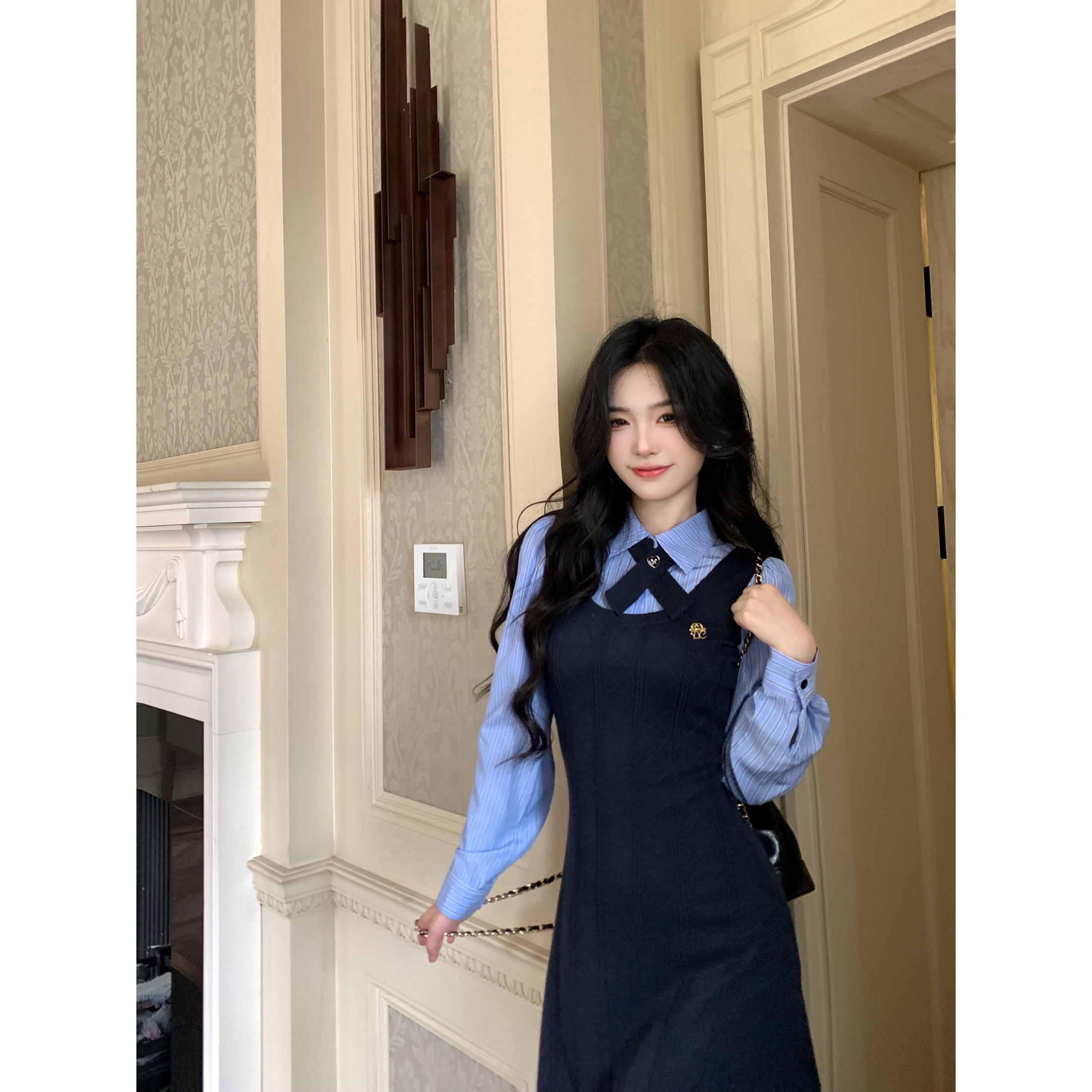 📚 Blovelan圣彼得学院 学院风条纹衬衫假两件连衣裙女2026春季新款