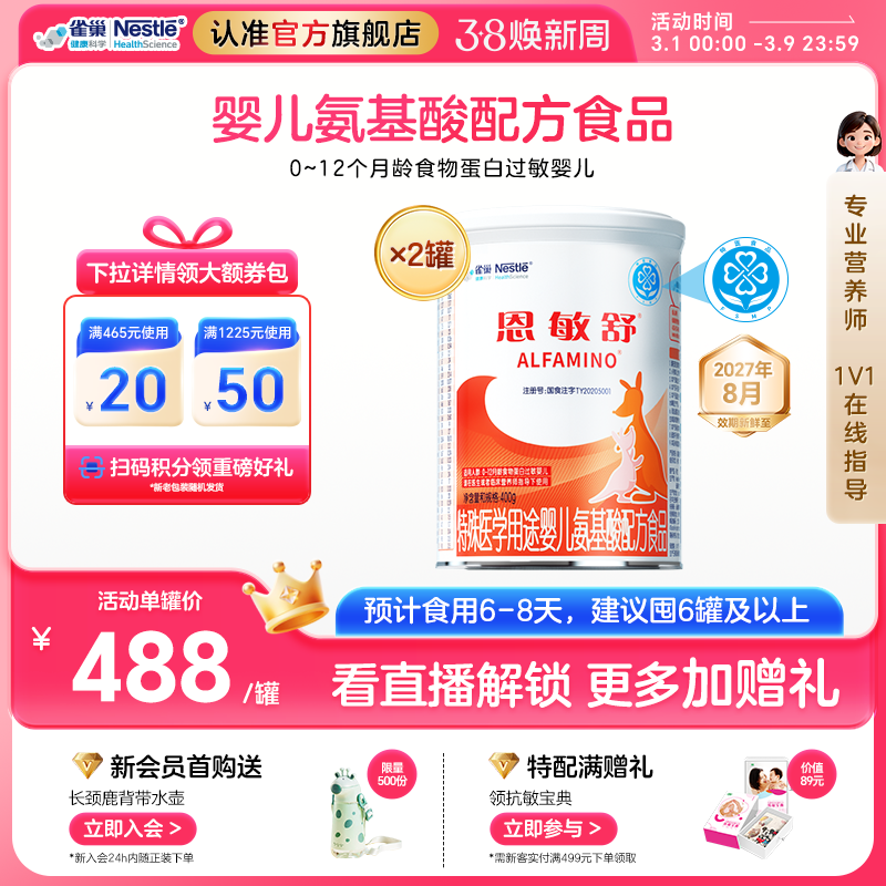 📚 雀巢恩敏舒特医用途婴儿配方食品二代氨基酸强化OPO正品400g*2