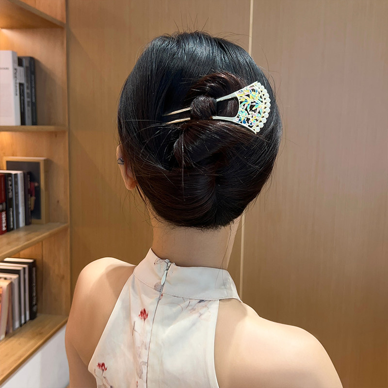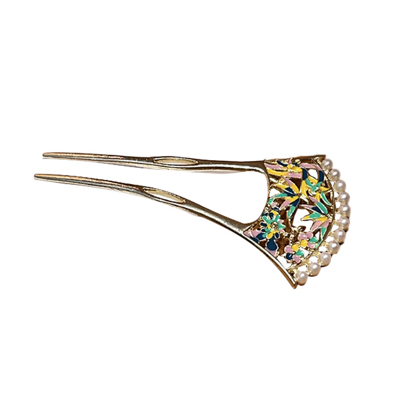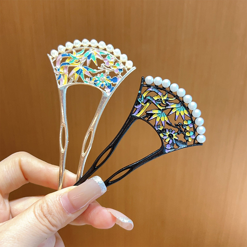 📚 竹园篱笆!彩绘珍珠镂发簪!U型发簪新中式后脑勺盘发簪子女头饰