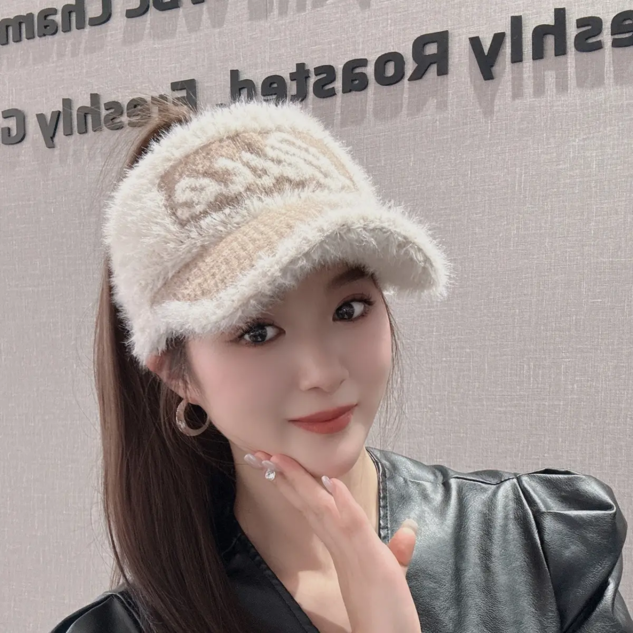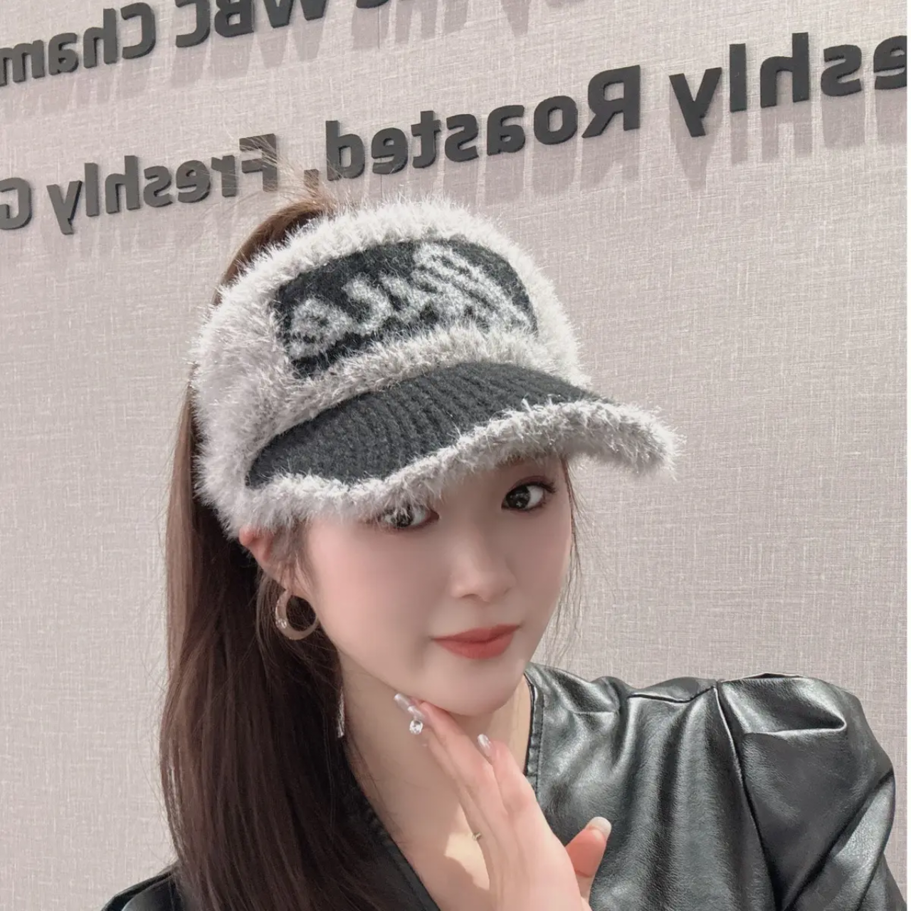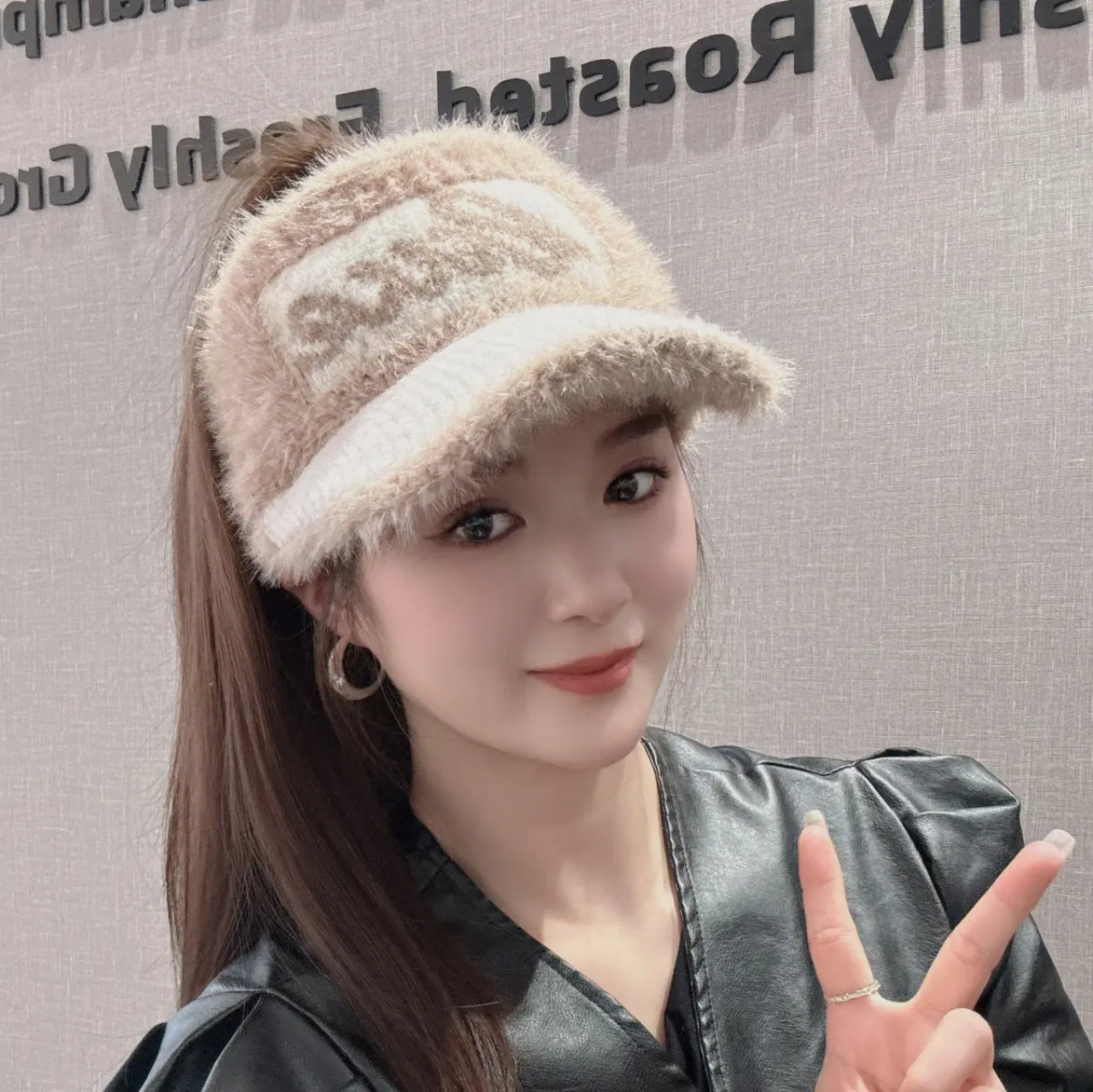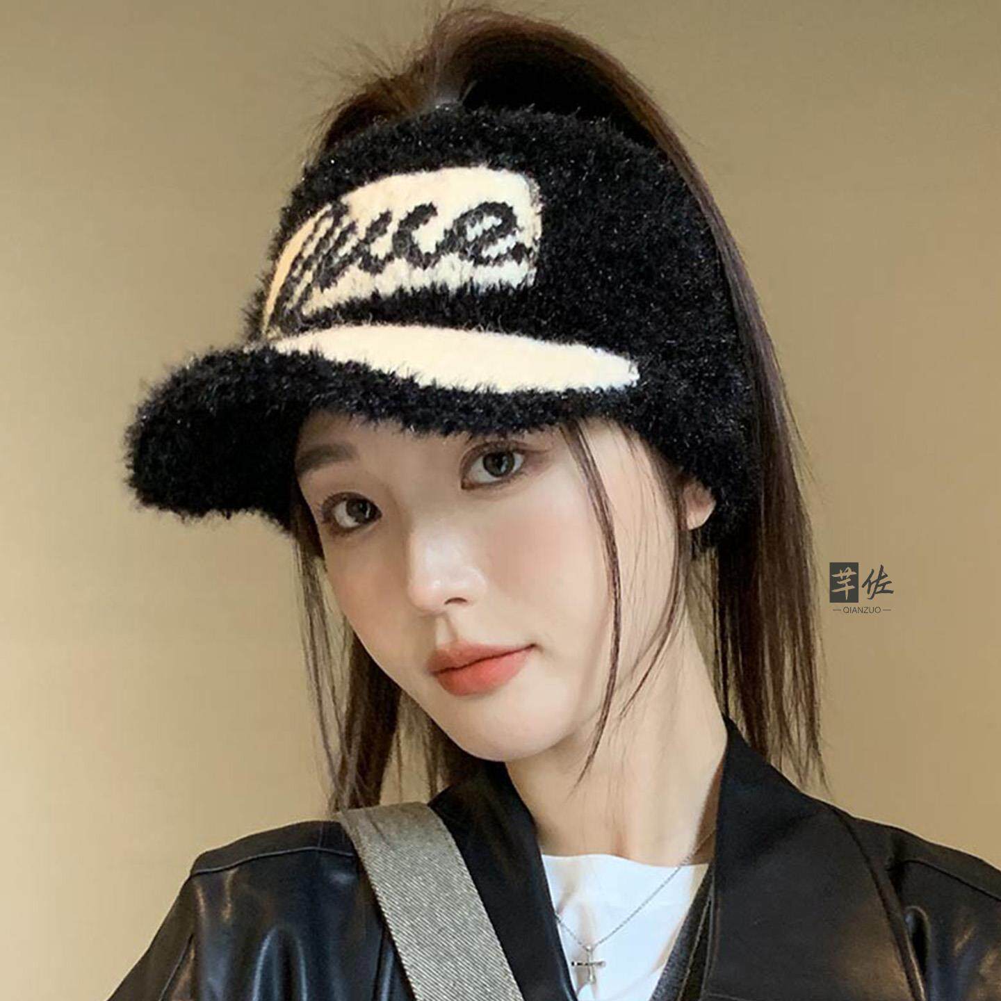 📚 毛绒保暖帽子女秋冬韩版百搭字母鸭舌空顶帽跑步扎马尾保暖毛线帽