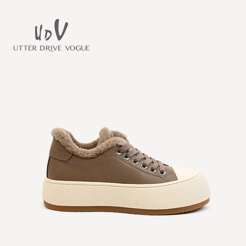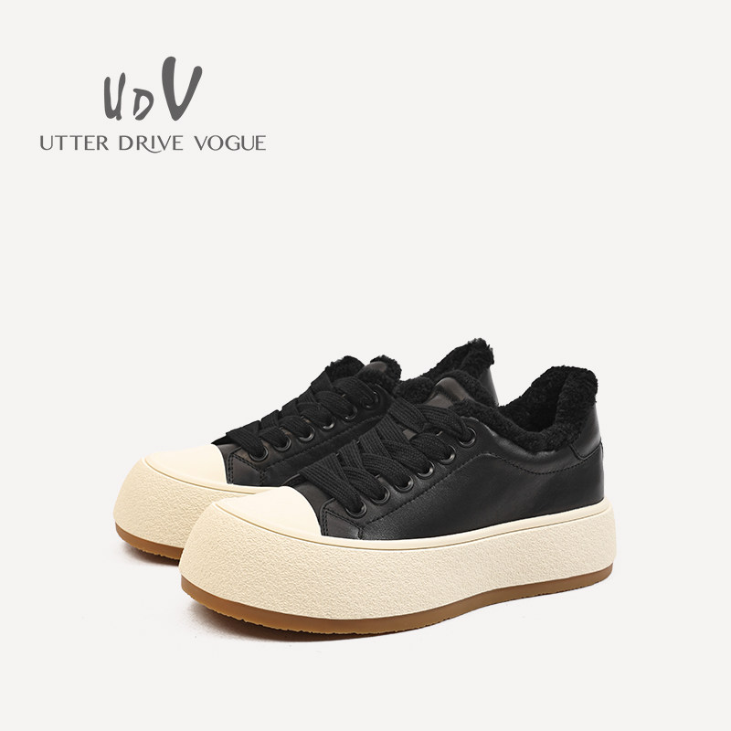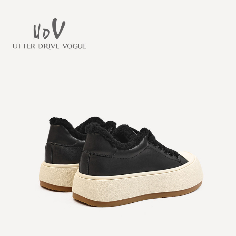 📚 UDV2024秋冬新品真皮牛皮时尚休闲鞋圆头平底运动风女鞋加绒板鞋