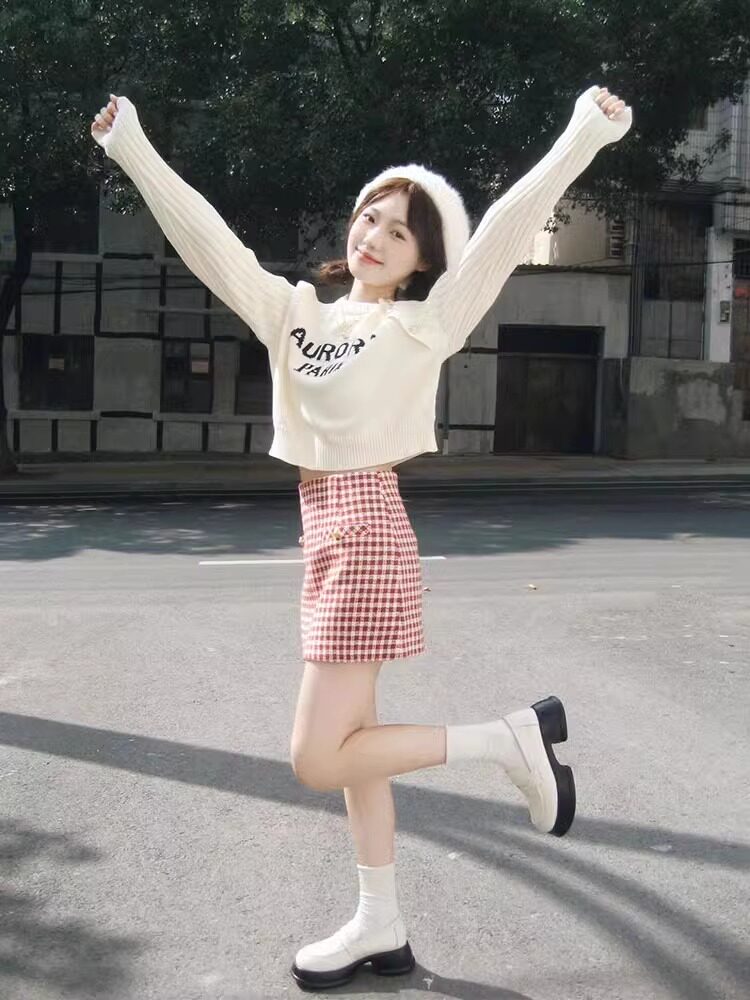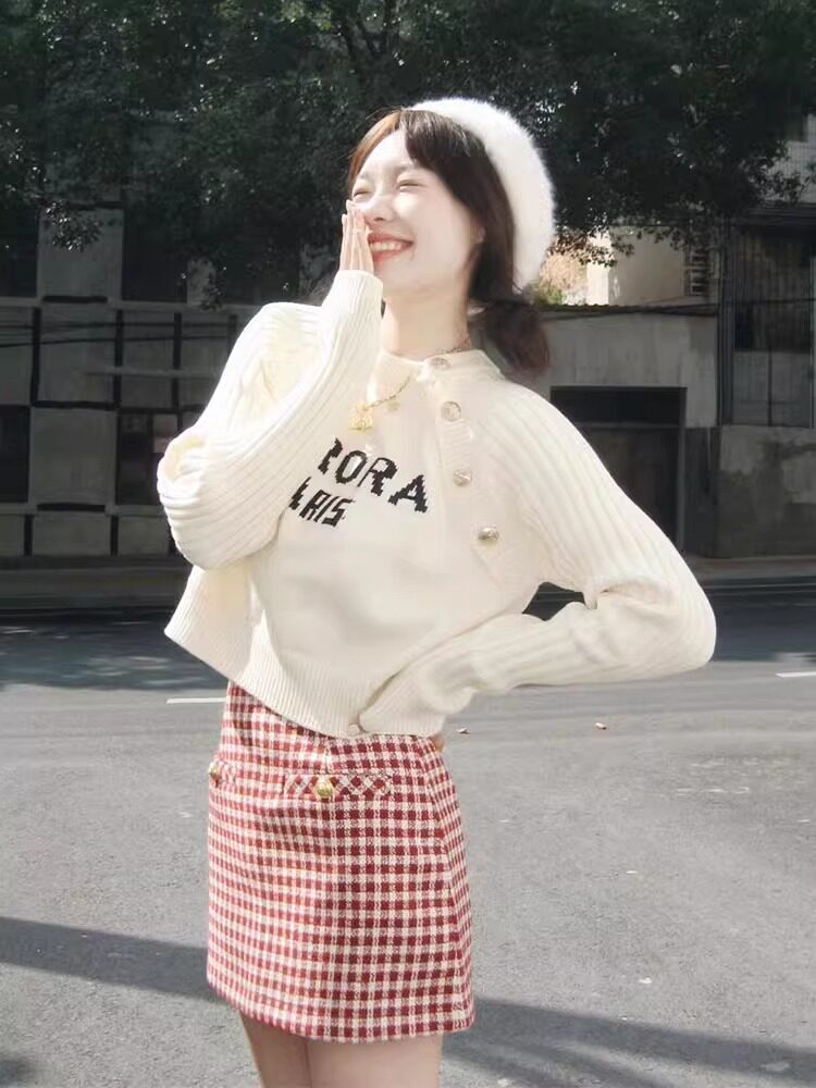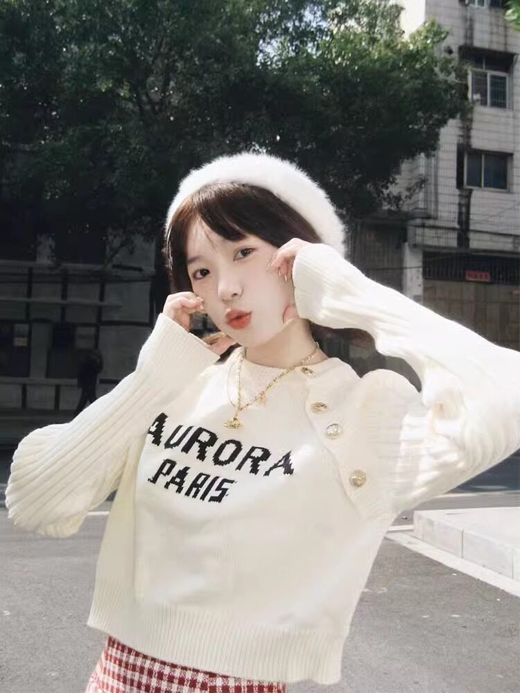 📚 戚薇同款衣服字母针织衫设计感短款上衣慵懒风宽松套头毛衣女秋冬