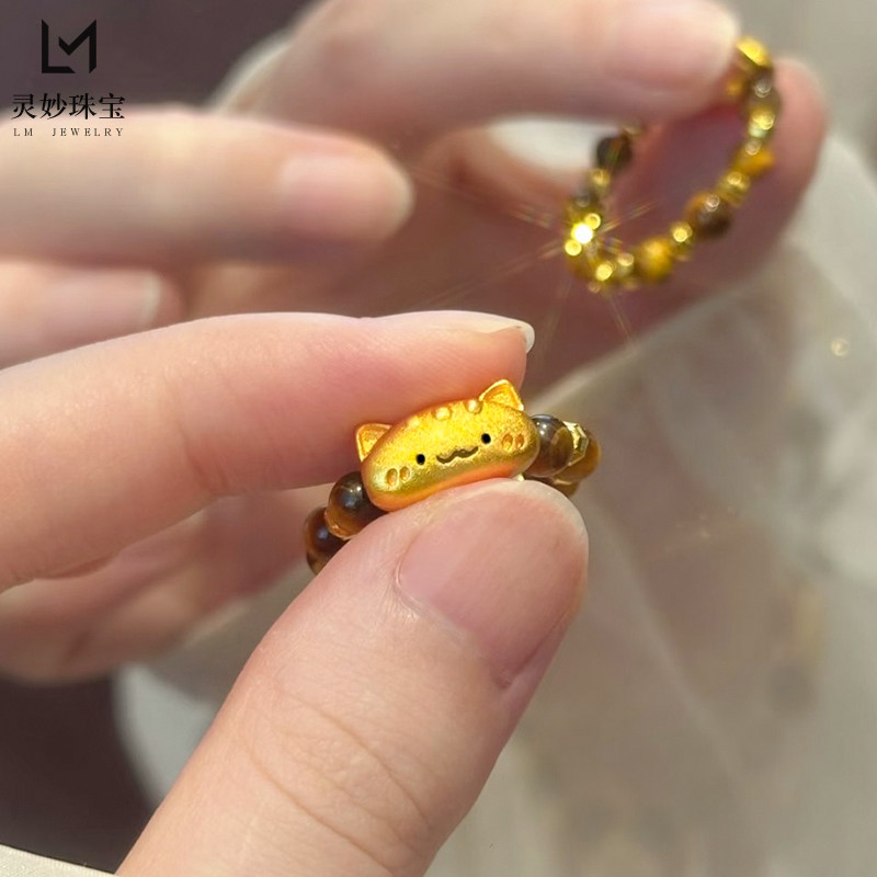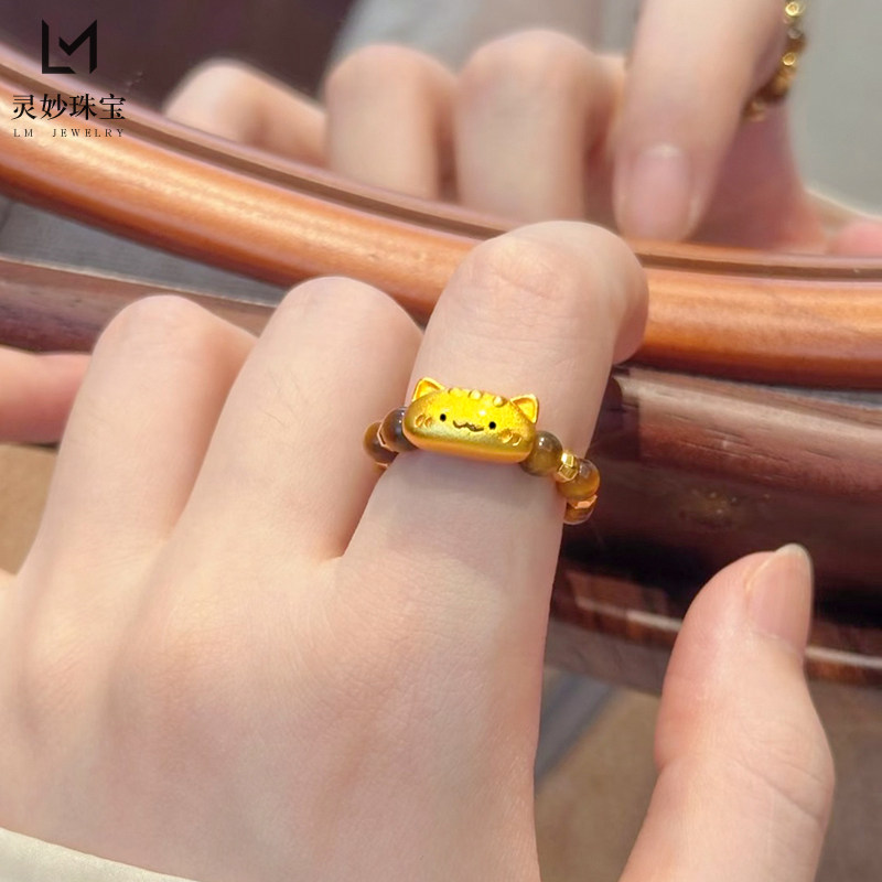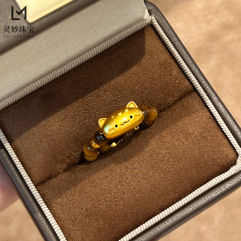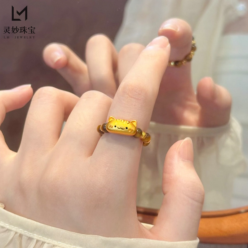📚 新中式复古沙金烧蓝法棍猫咪虎眼石戒指蹦迪珠转运珠食指戒送女友