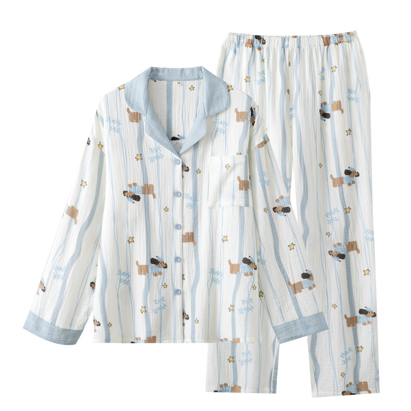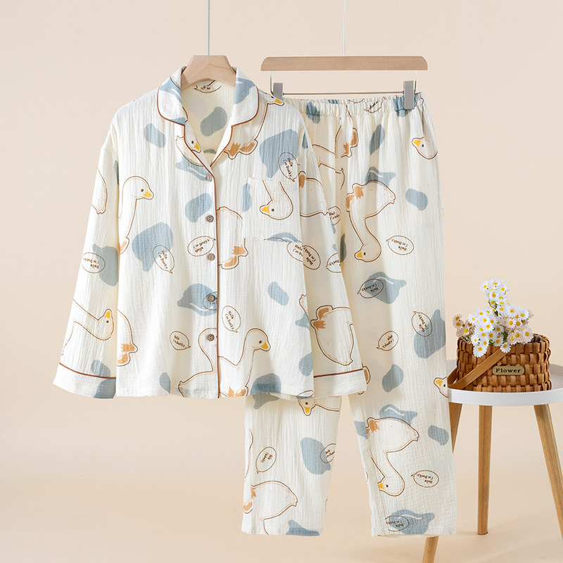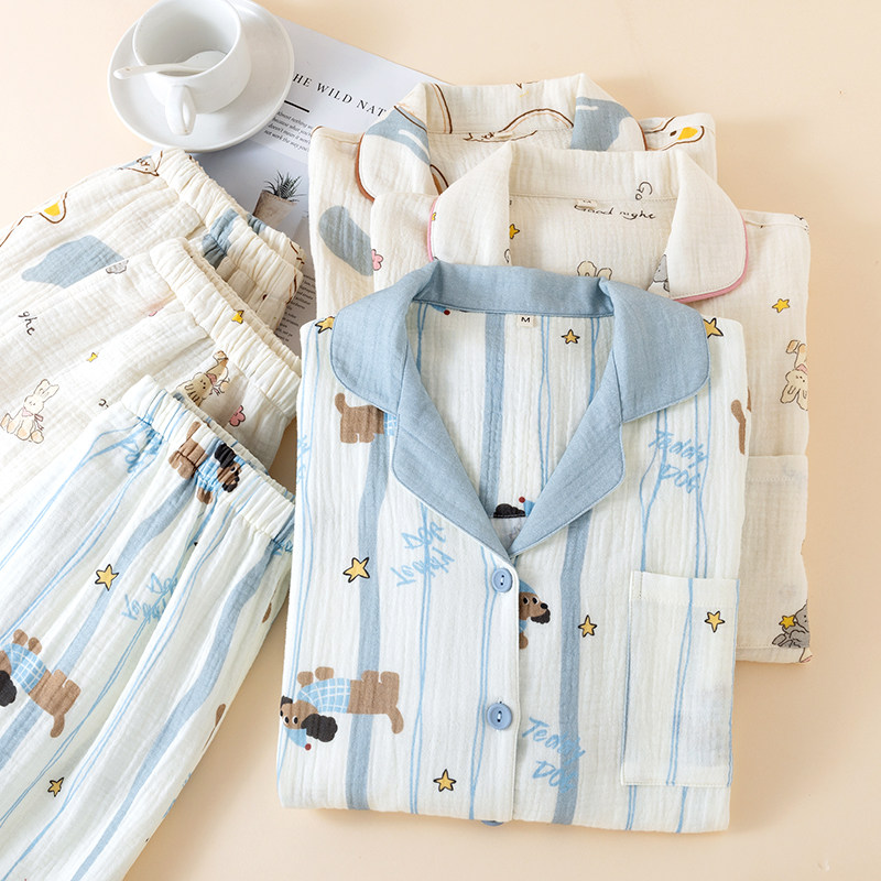 📚 网红卡通印花纯棉纱布睡衣女款春秋夏季薄款长袖棉麻家居服套装