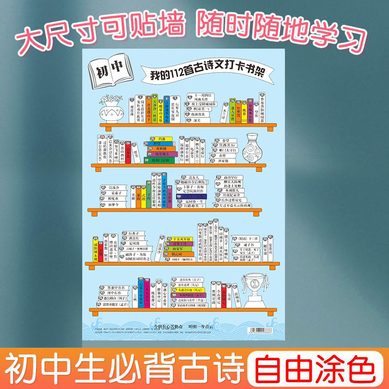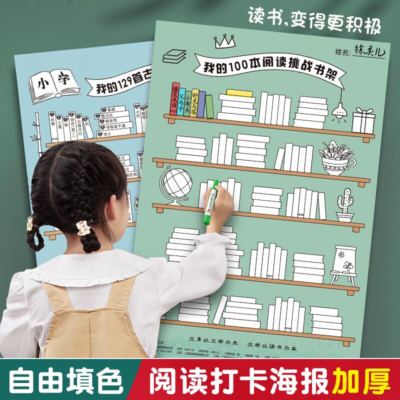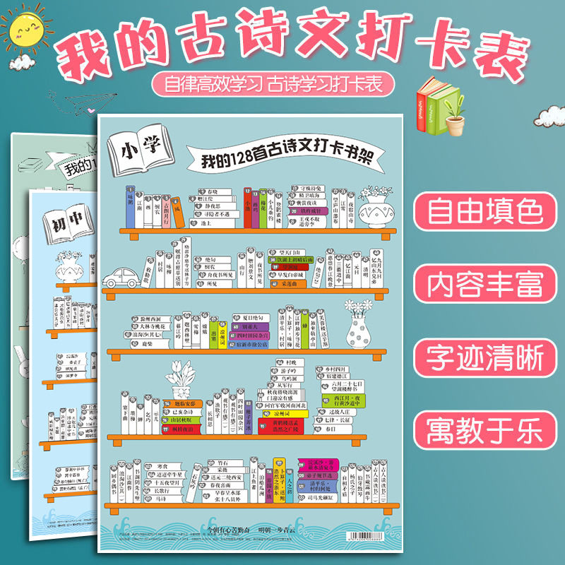 📚 小学古诗打卡书架记录表挂图我的古诗小书架海报我的100本阅读挑战空白涂色表初中必备古诗文打卡背诵计划表