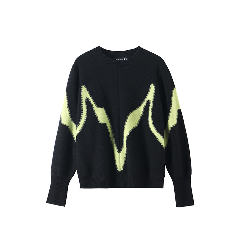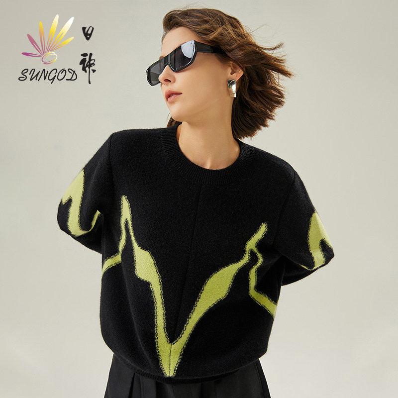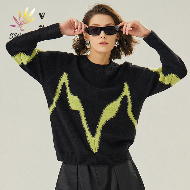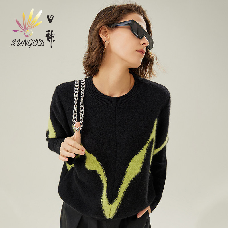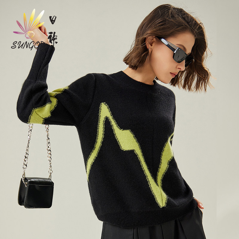 📚 日神秋冬新款圆领打底羊绒衫女100纯山羊绒时尚撞色套头针织毛衣