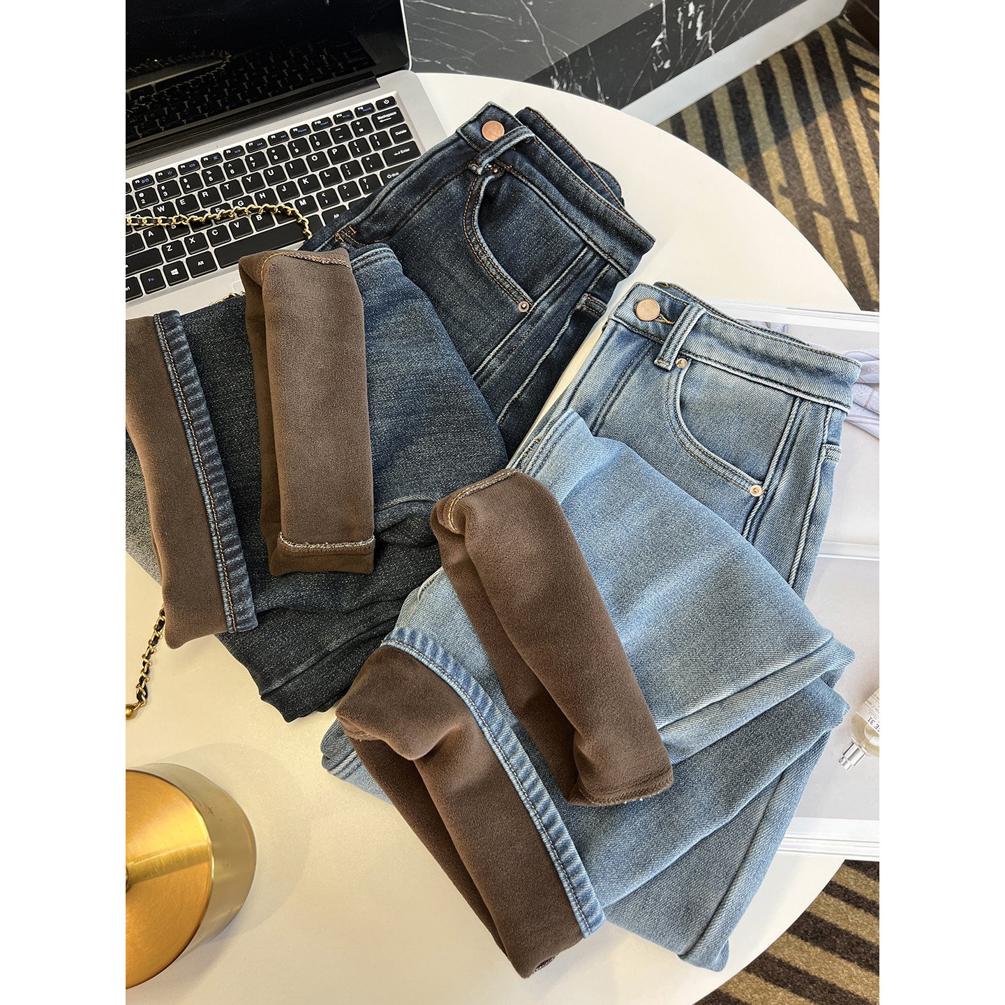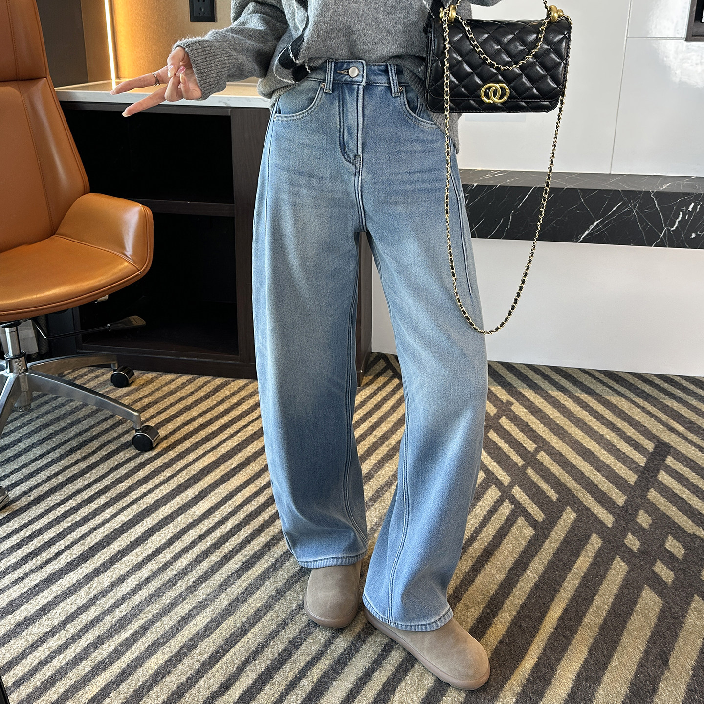 📚 收胯一jue!~密密绒弯刀牛仔裤女秋冬新款保暖加厚宽松阔腿长裤子