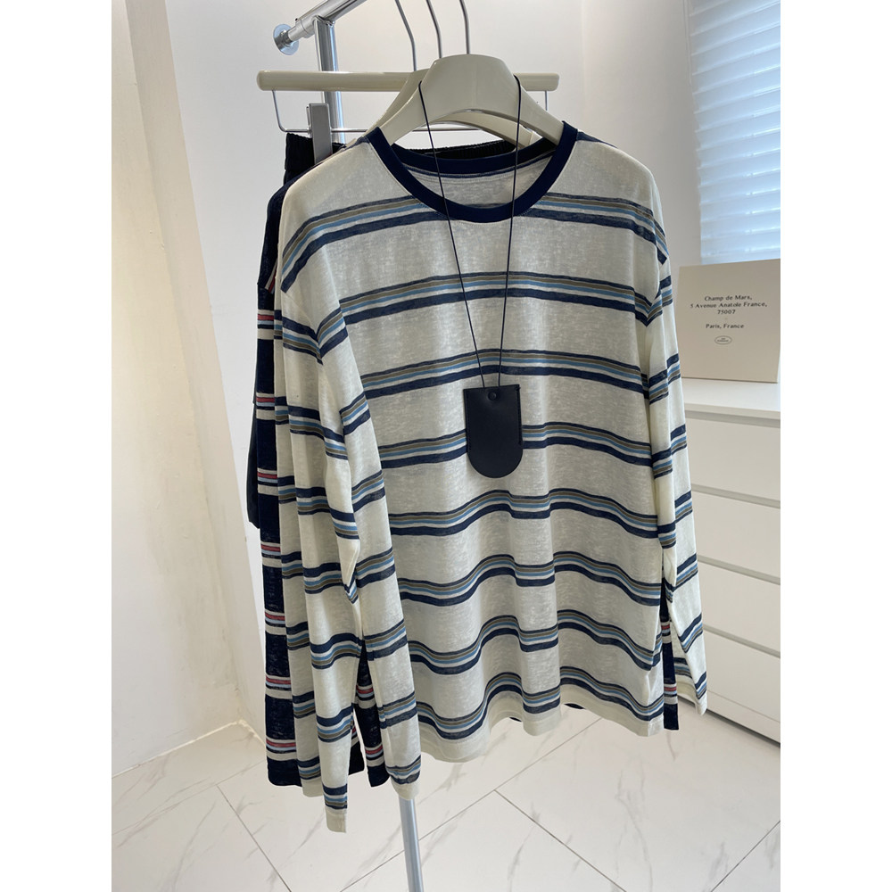 📚 慵懒感~复古显白撞色领条纹防晒衫女!夏垂感宽松显瘦休闲长袖t恤