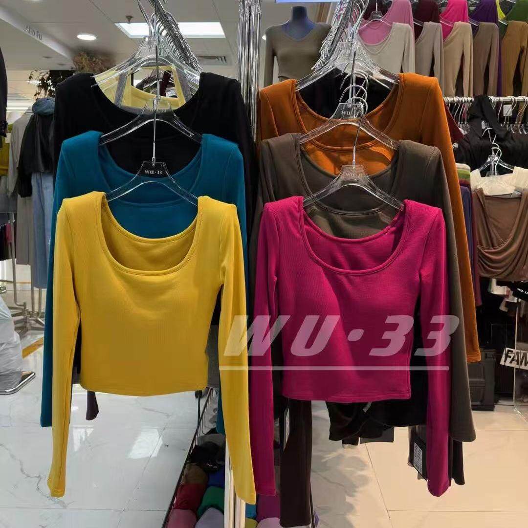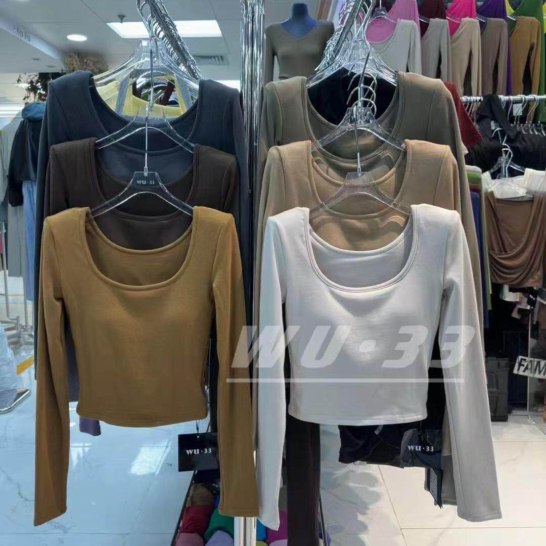 📚 2025冬季新款韩版wu33加绒长袖u领T恤修身显瘦带胸垫打底衫上衣女