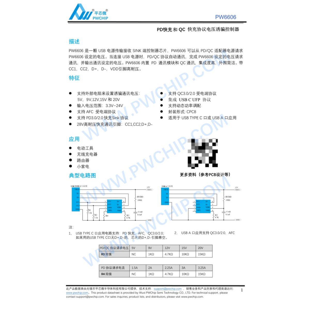 📚 PD/QC快充诱骗模块PW6606快充电压诱骗芯片可选5V,9V,12V,15V,20V
