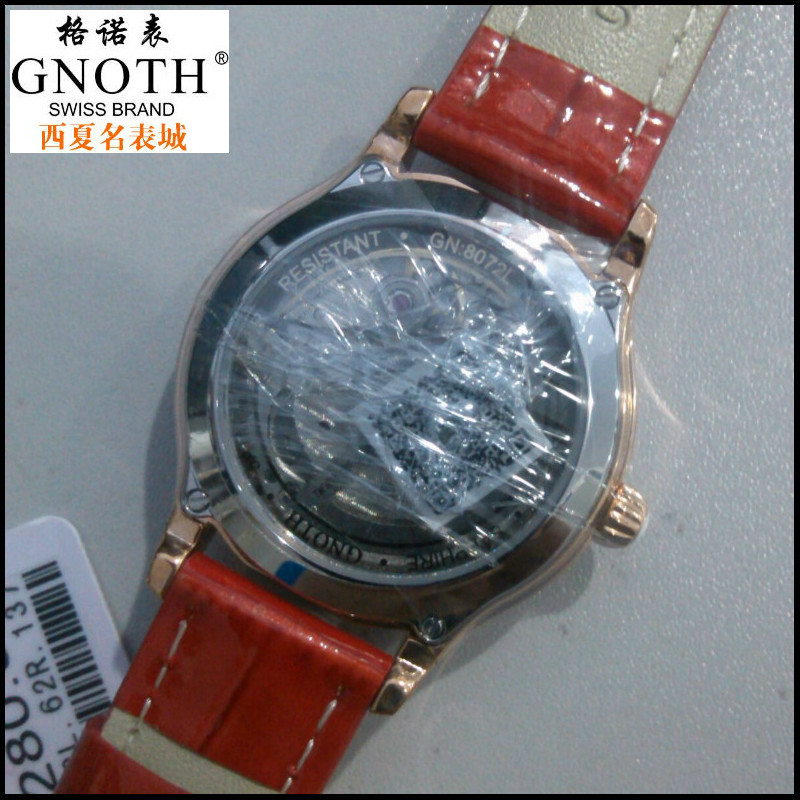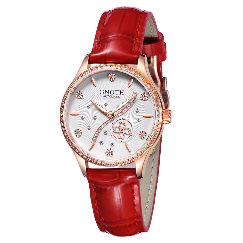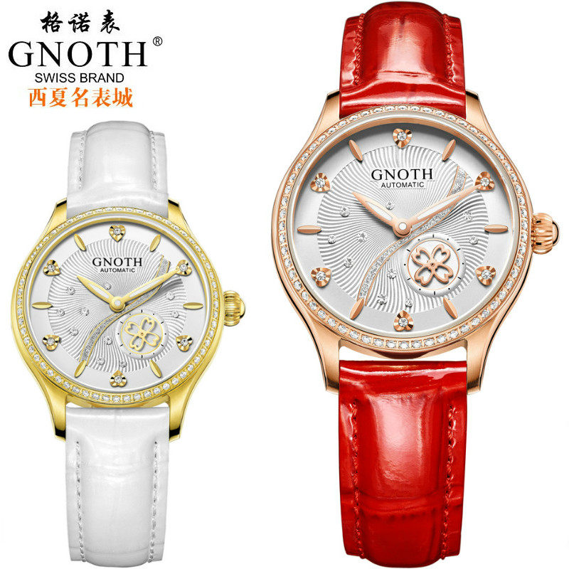 📚 格诺手表女士夜光真皮自动机械表正品包邮镂空防水镶钻女表8072L