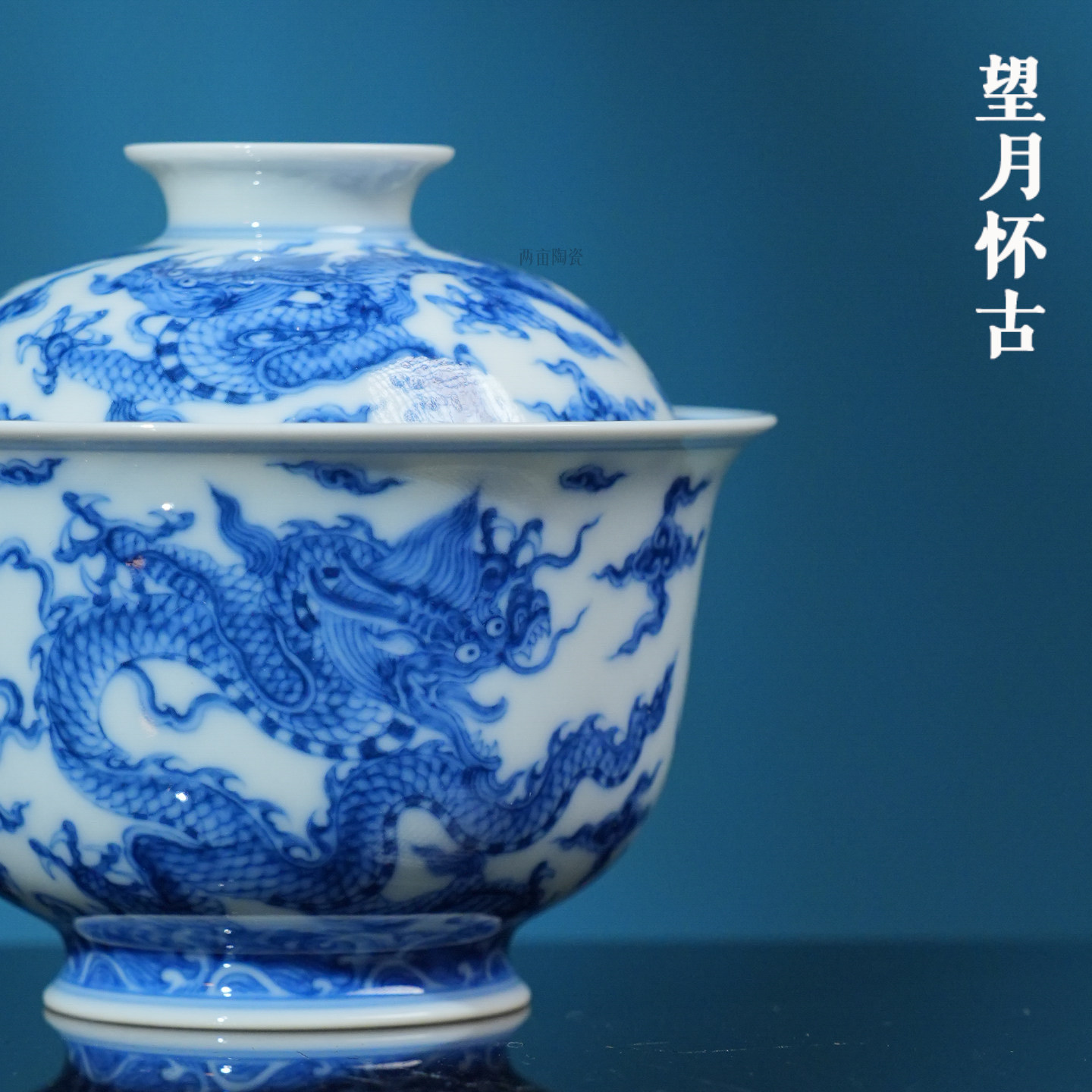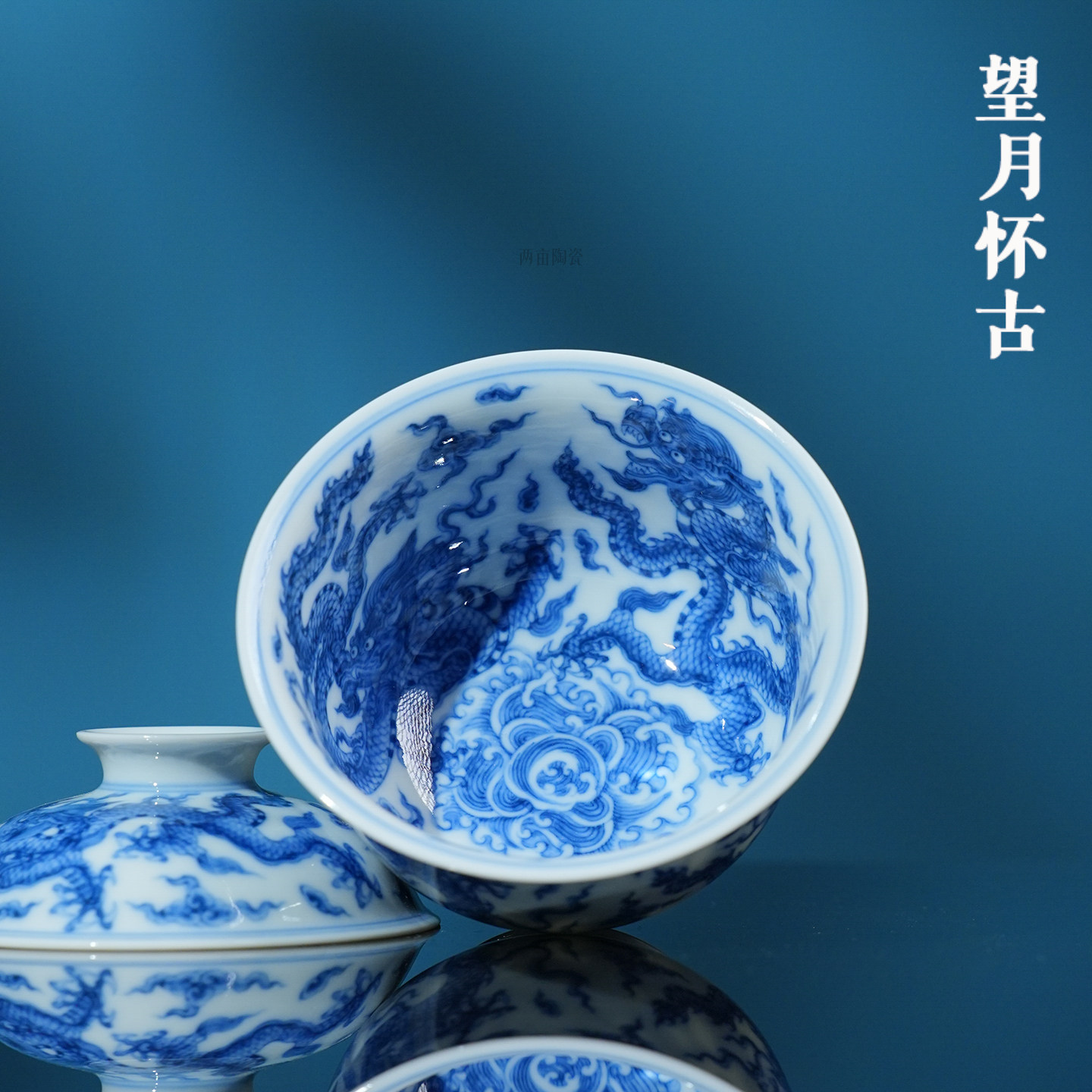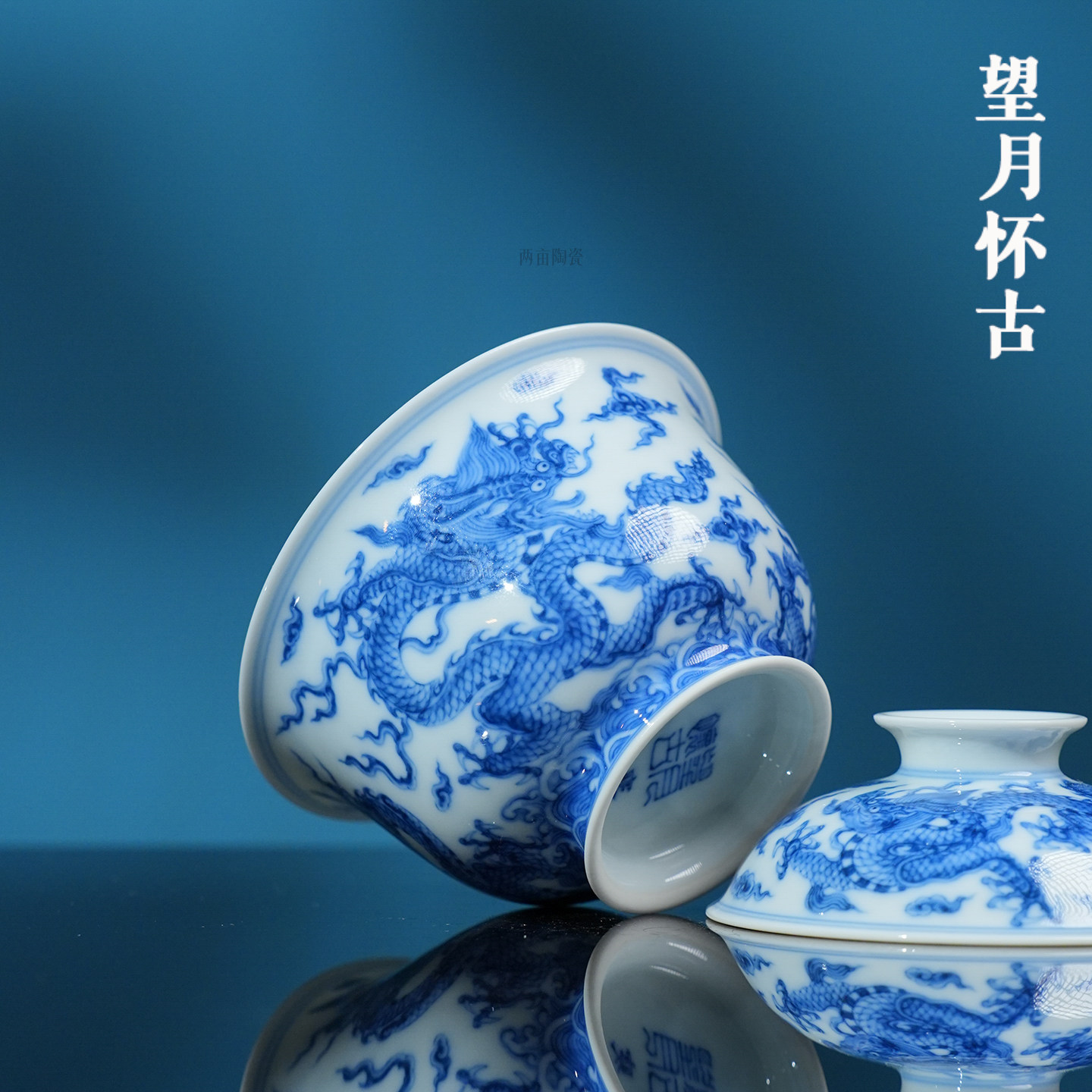 📚 望月怀古九龙岩茶盖碗100ml 景德镇青花重工送礼手工家用茶碗