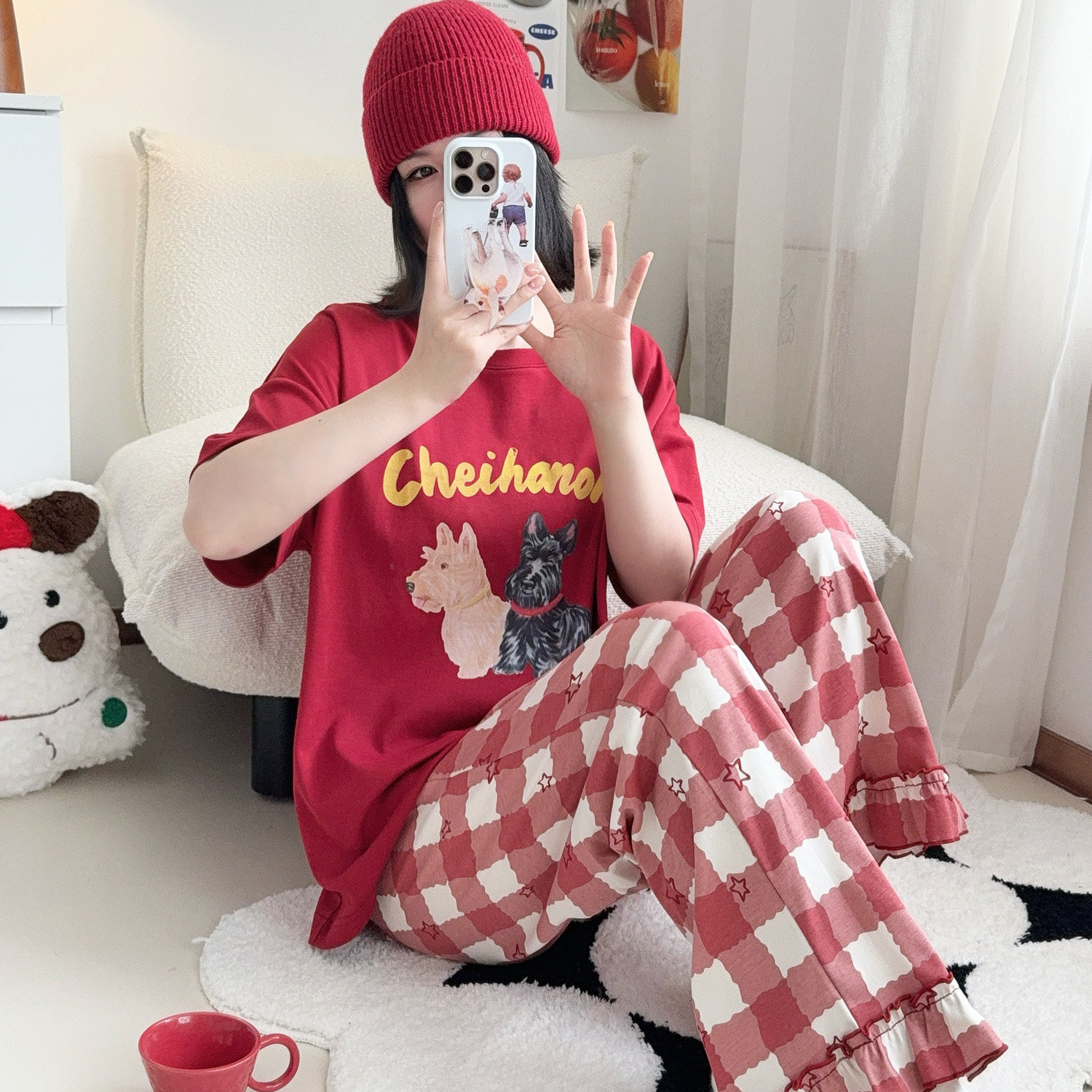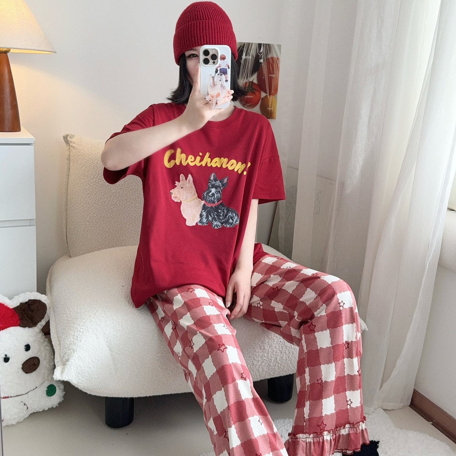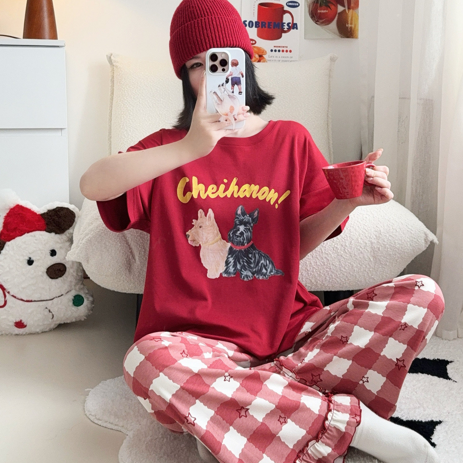 📚 PINKWEO 卡通狗短袖长裤睡衣女夏宽松休闲纯棉格子红色家居服套装