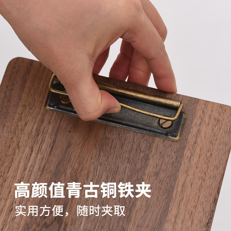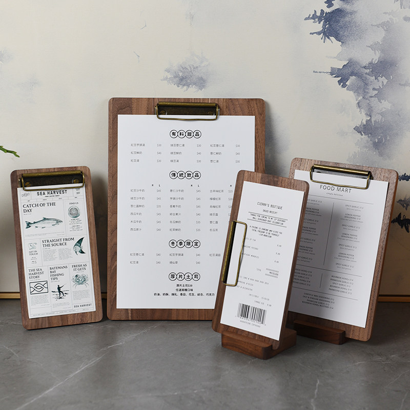 📚 北美黑胡桃木青铜夹餐饮菜单夹本餐厅立式展示牌实木木板桌面定制