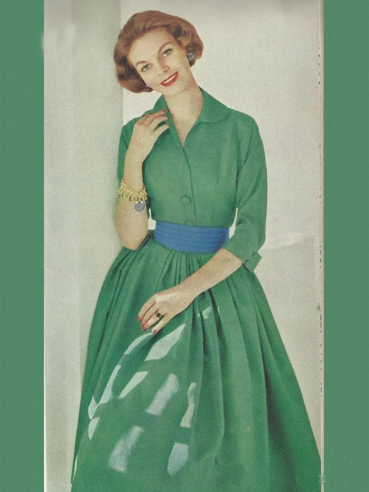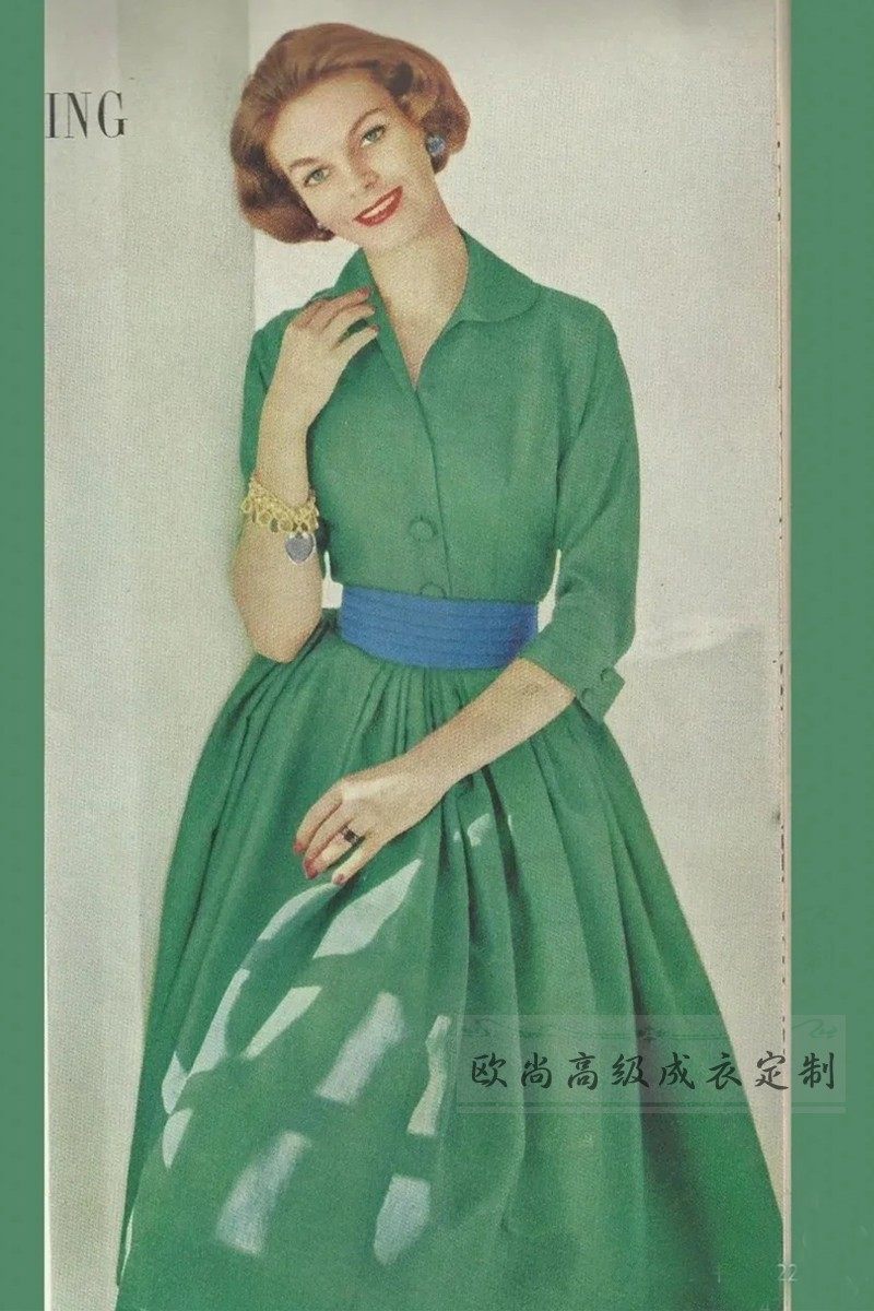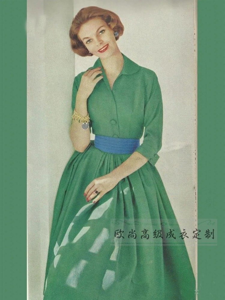 📚 高级定制1950S复古绿色三醋酸连衣裙女收腰大摆裙长款气质优雅夏