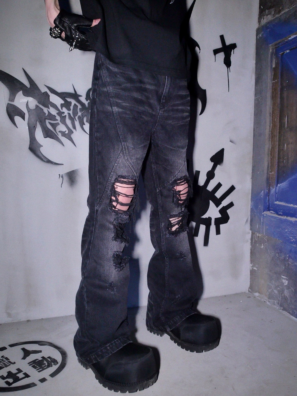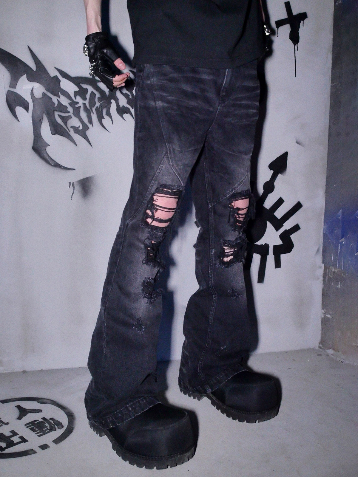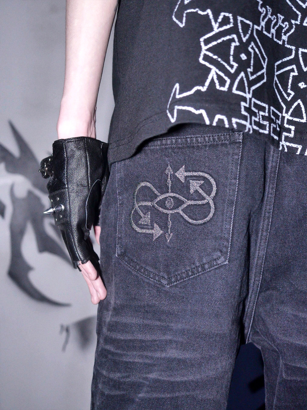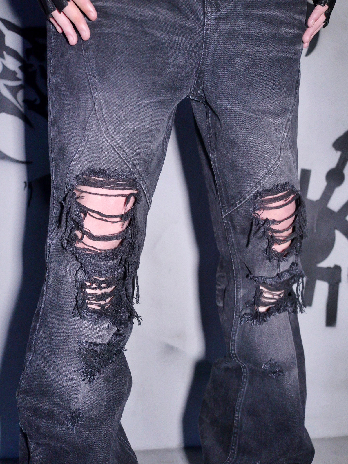 📚 Phantomhunter芬特亨克破洞猫须喷马骝刺绣水洗做旧黑色牛仔裤