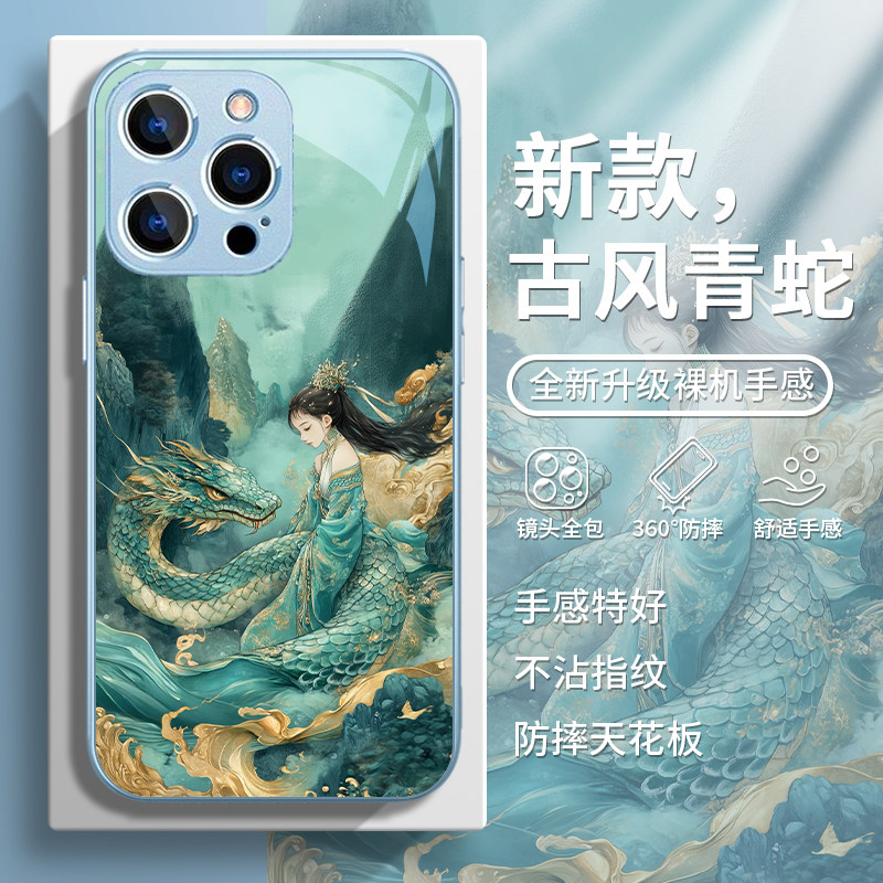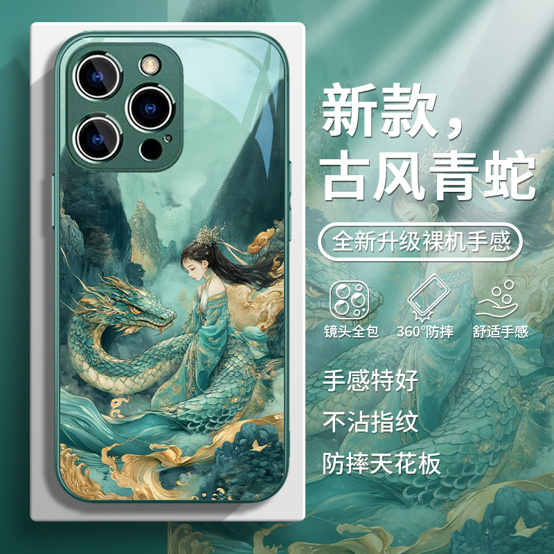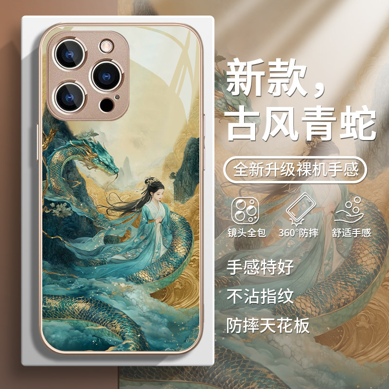 📚 适用古风青蛇iphone14手机壳15plus新款苹果16pro国风13promax蛇年pro高级感max女款苹果12mini新年11pro玻璃