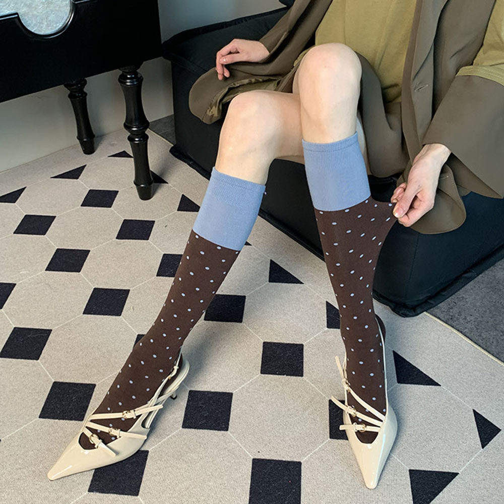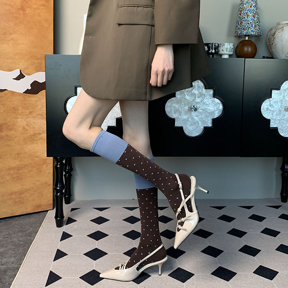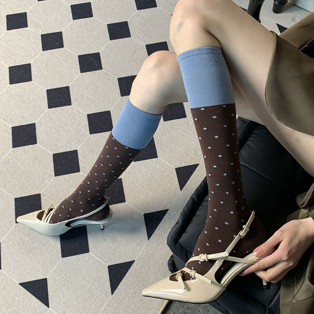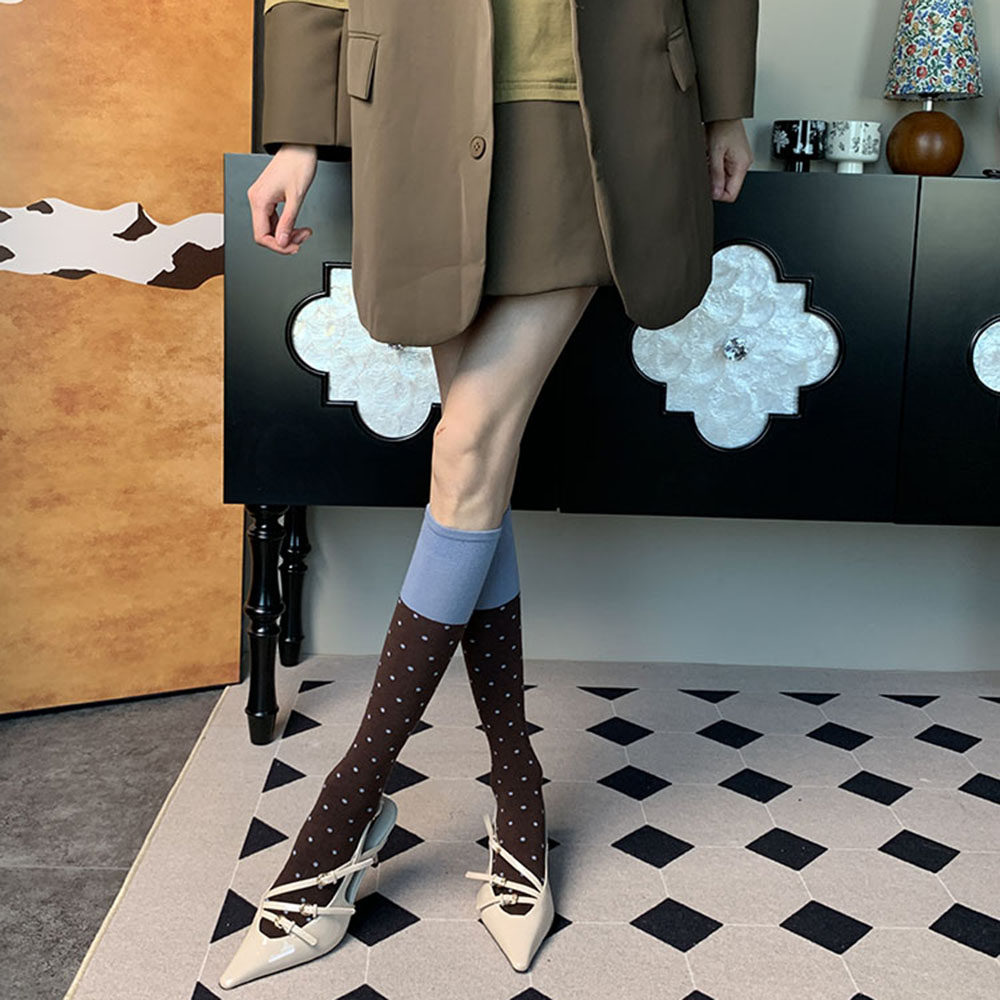 📚 打破沉寂的氛围~夏季法式复古可露丽风撞色拼接波点咖啡小腿袜