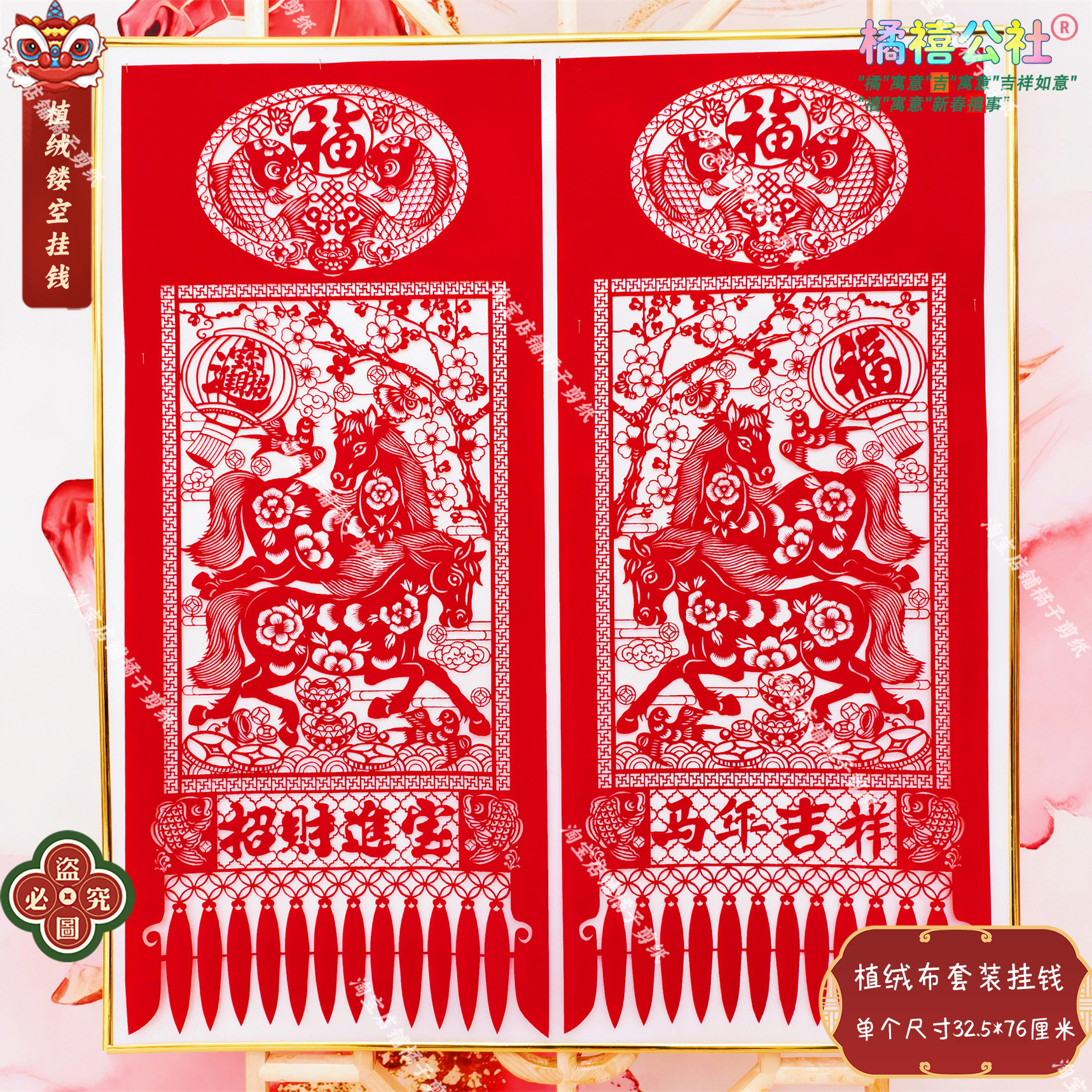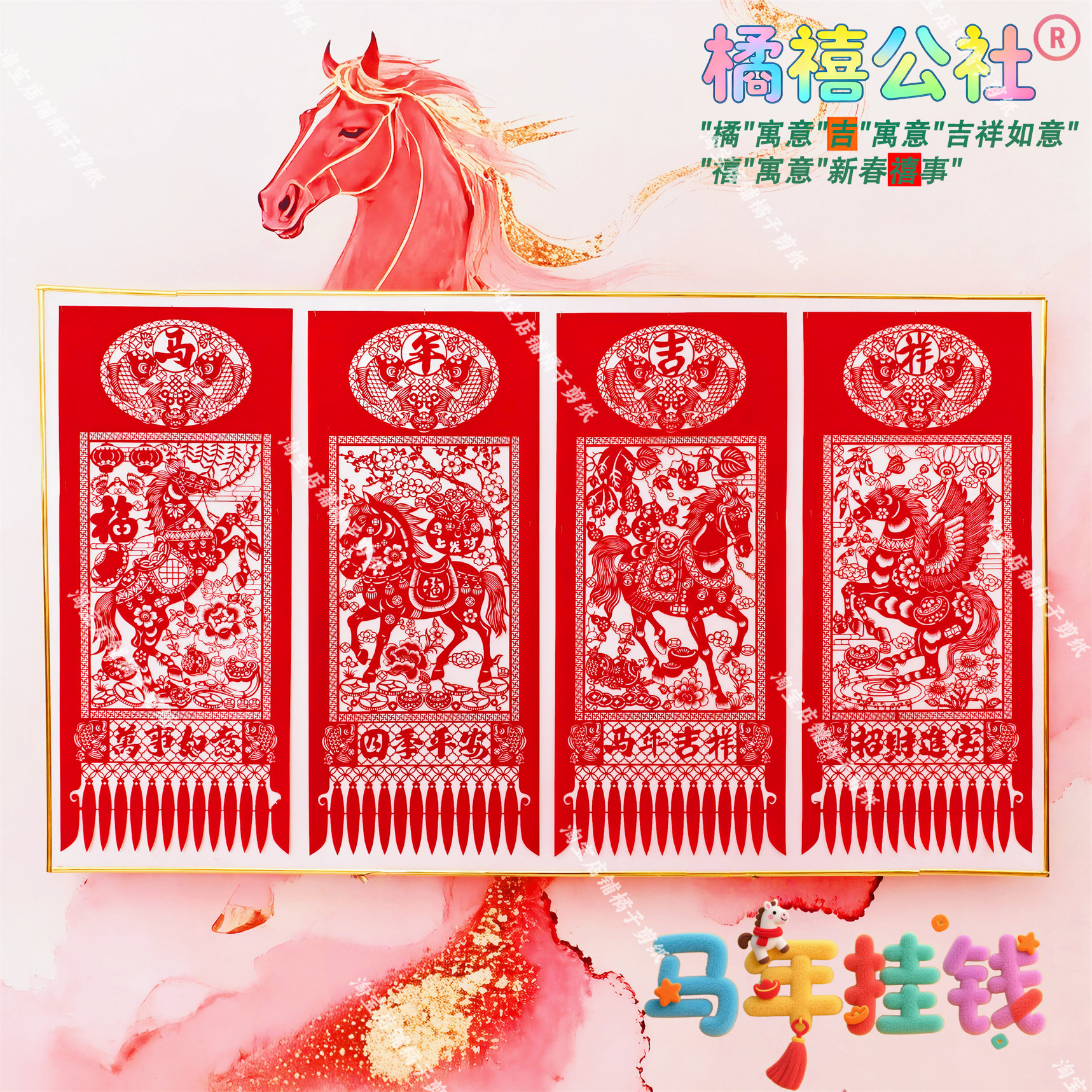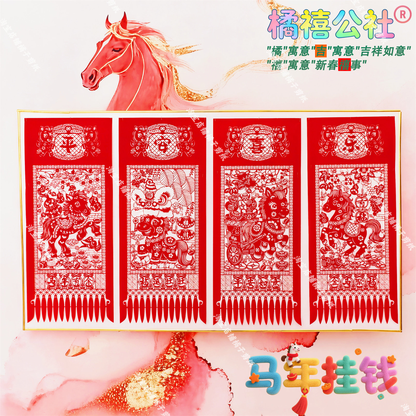 📚 马年植绒布四联吊钱挂钱 2026春节天津剪纸窗花特色新年镂空装饰