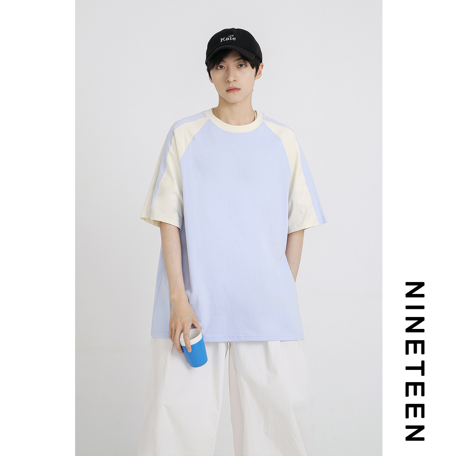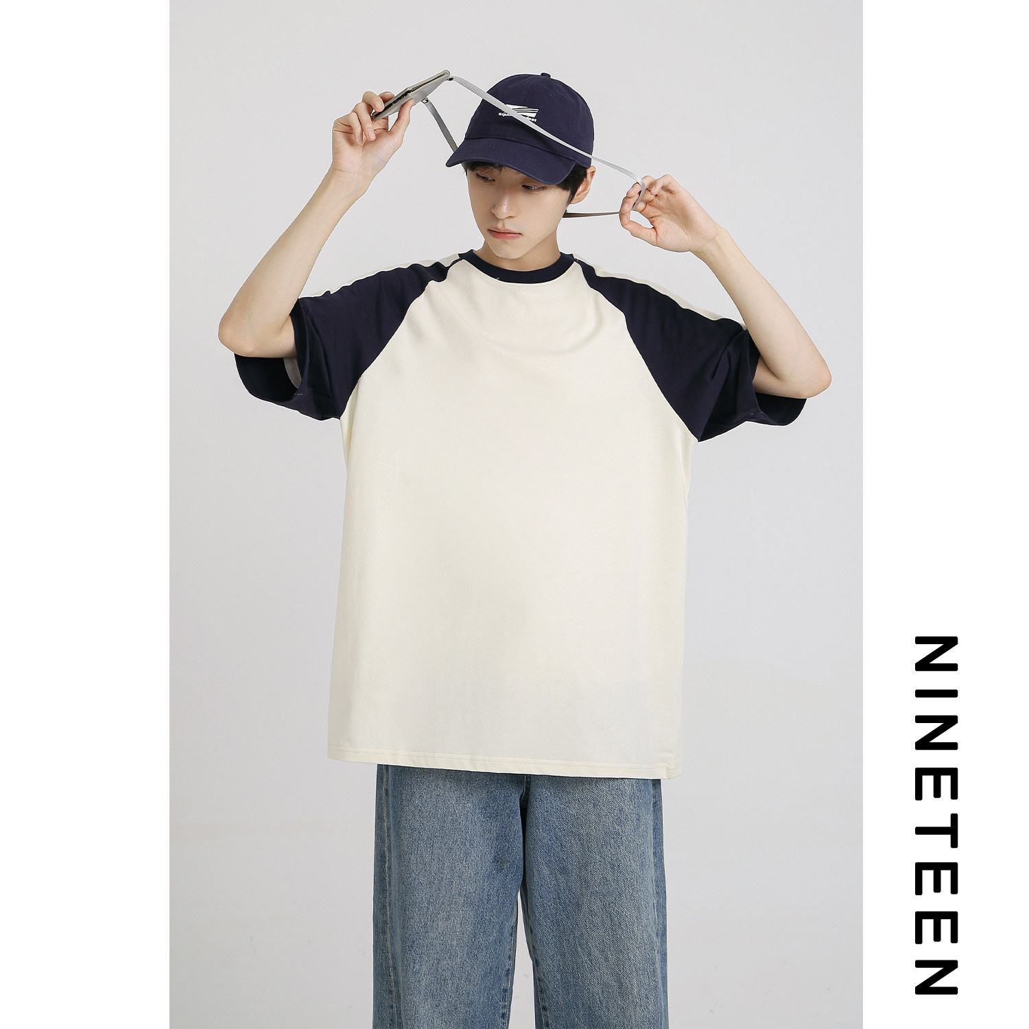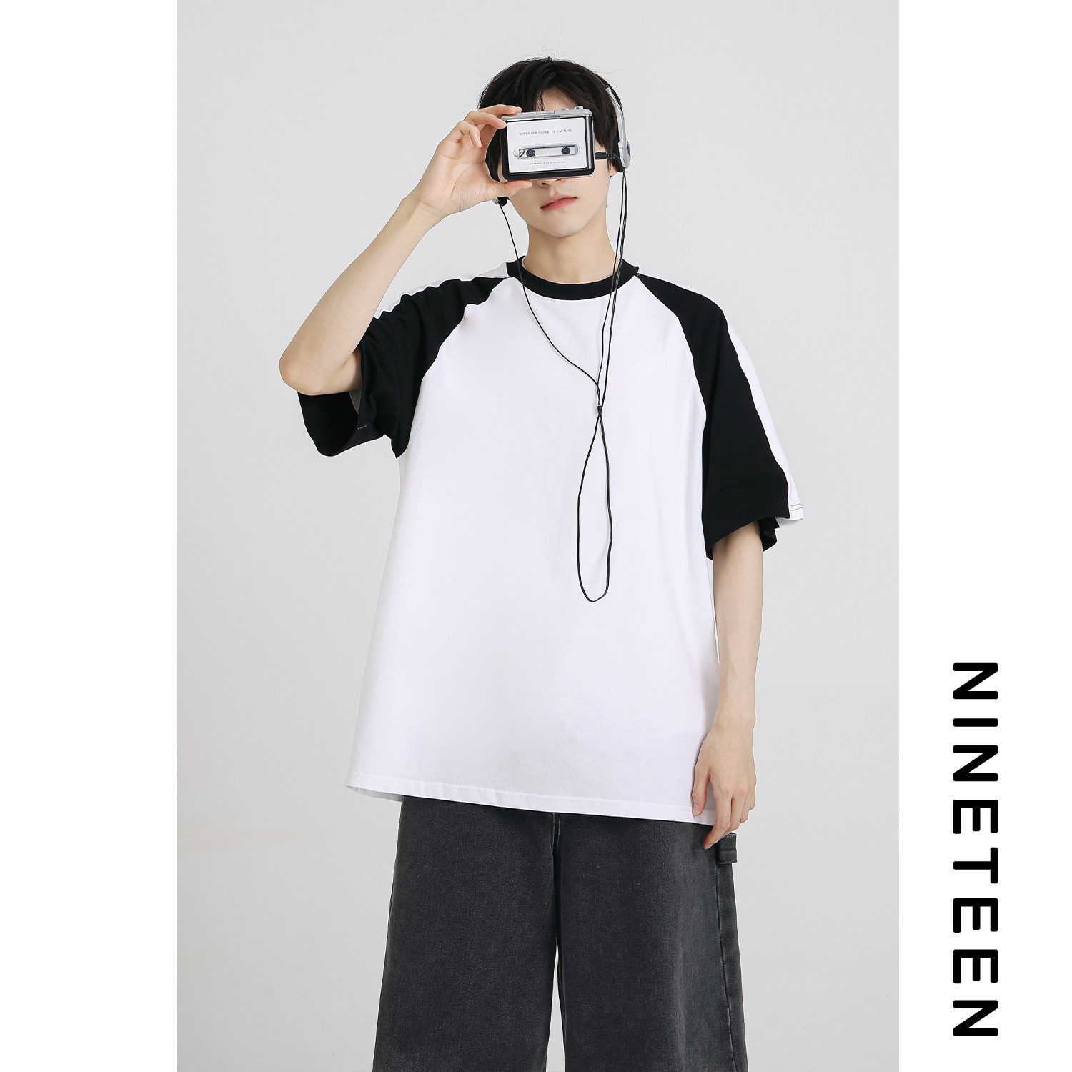 📚 十九秋/夏季新款日系撞色插肩袖短袖T恤男宽松休闲上衣青少年学生