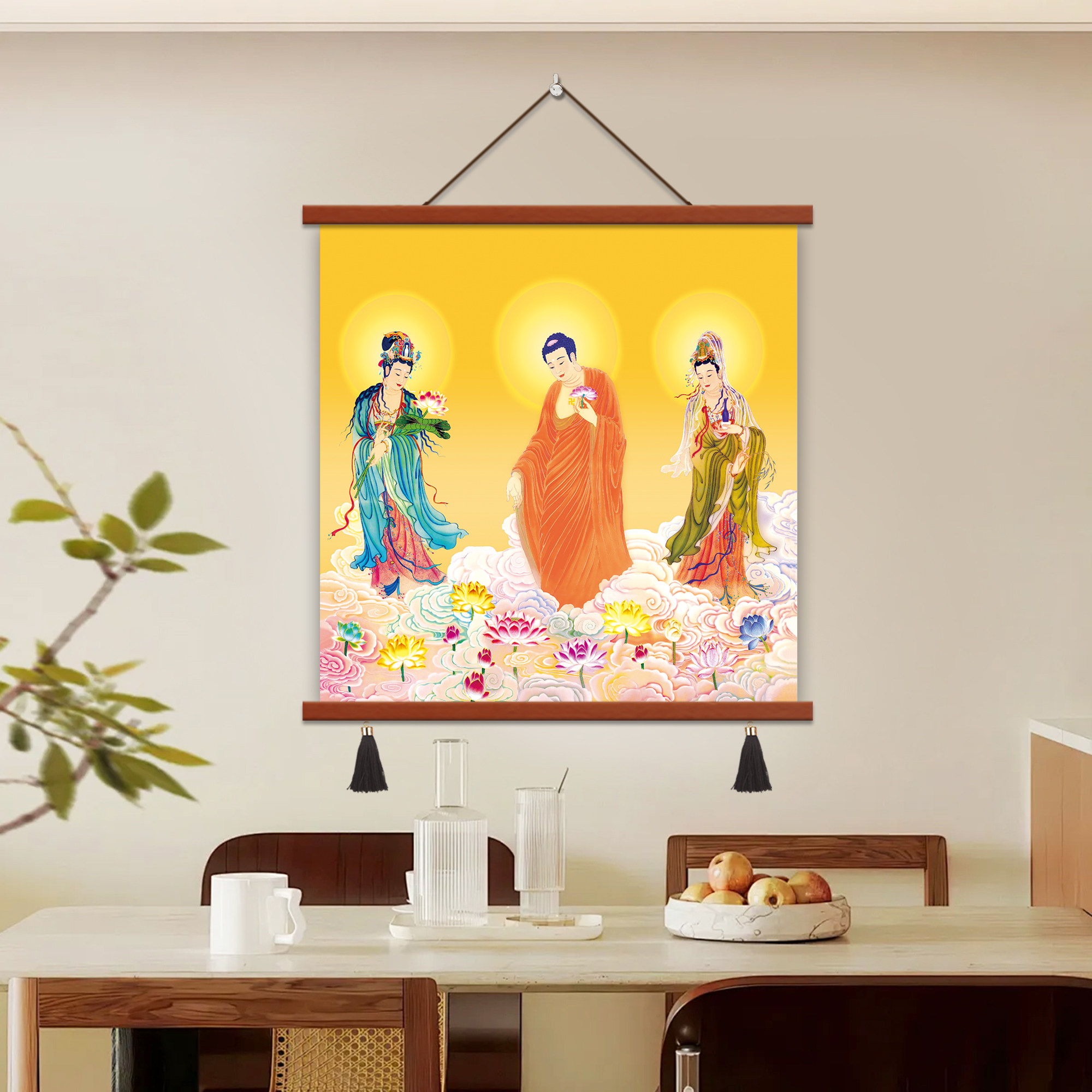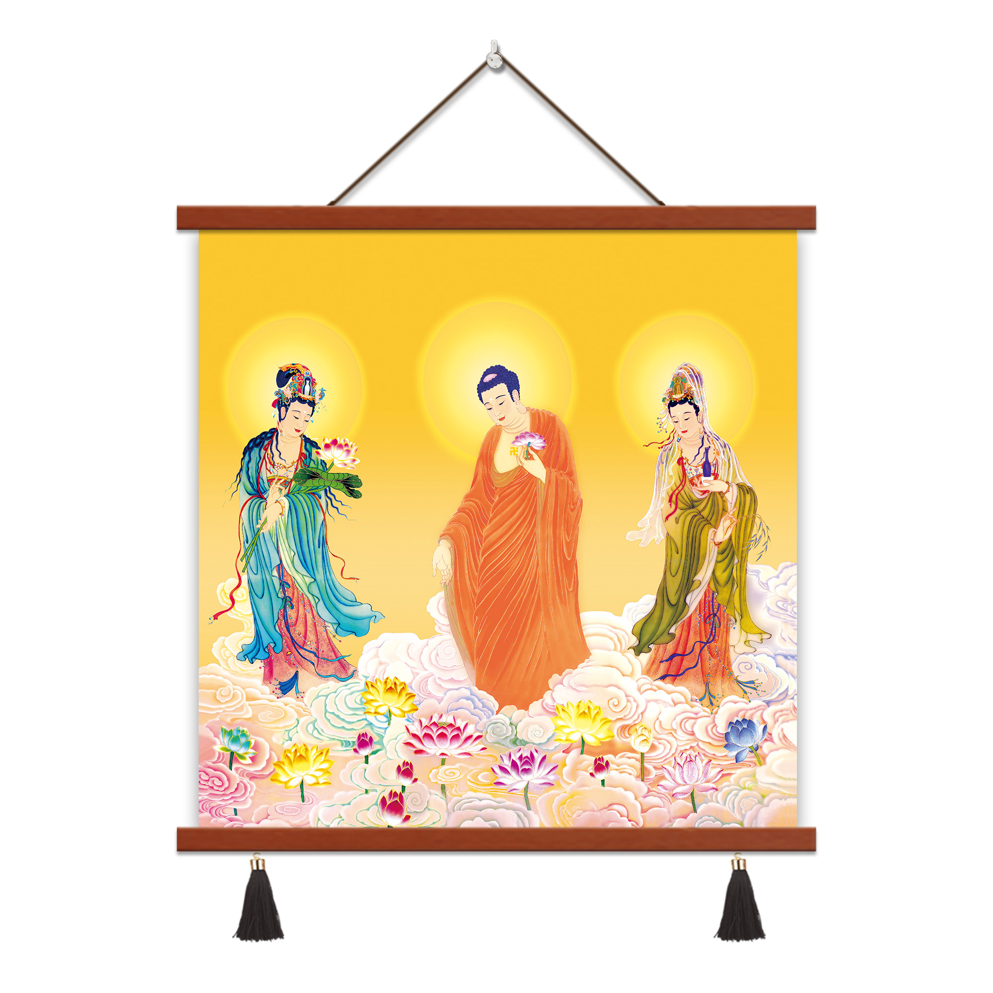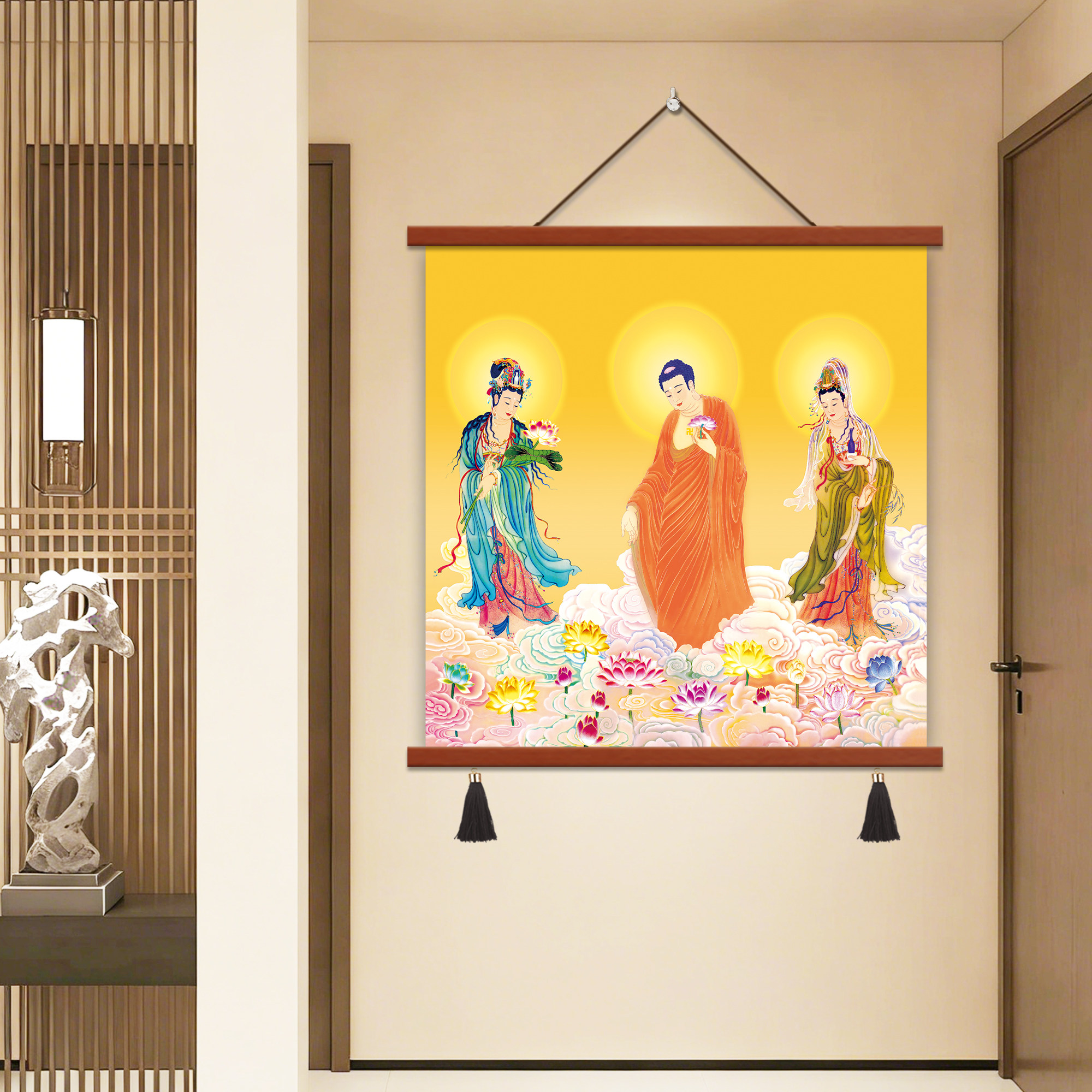 📚 西方三圣原木挂轴阿弥陀佛大势至观世音三尊画像佛堂客厅装饰挂画