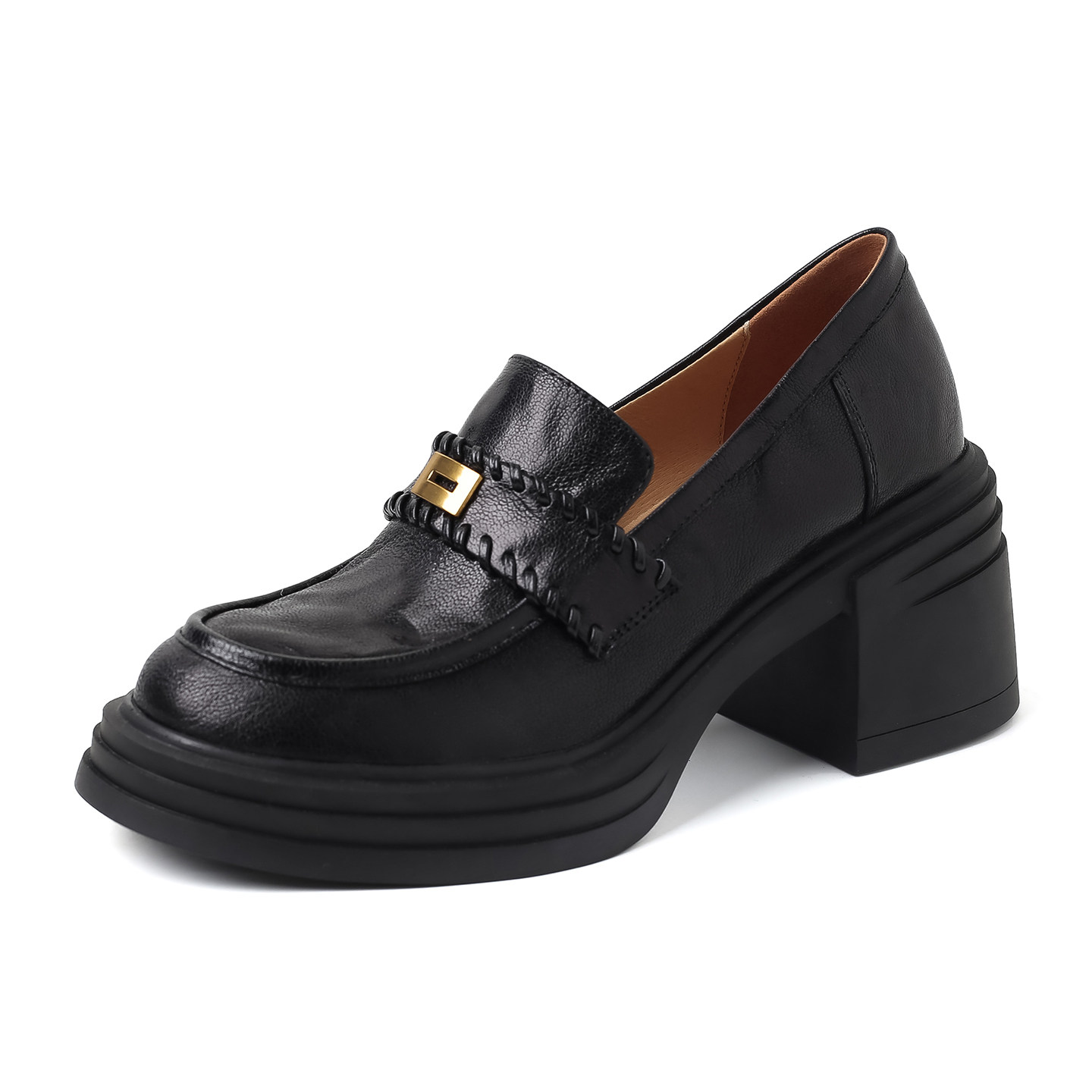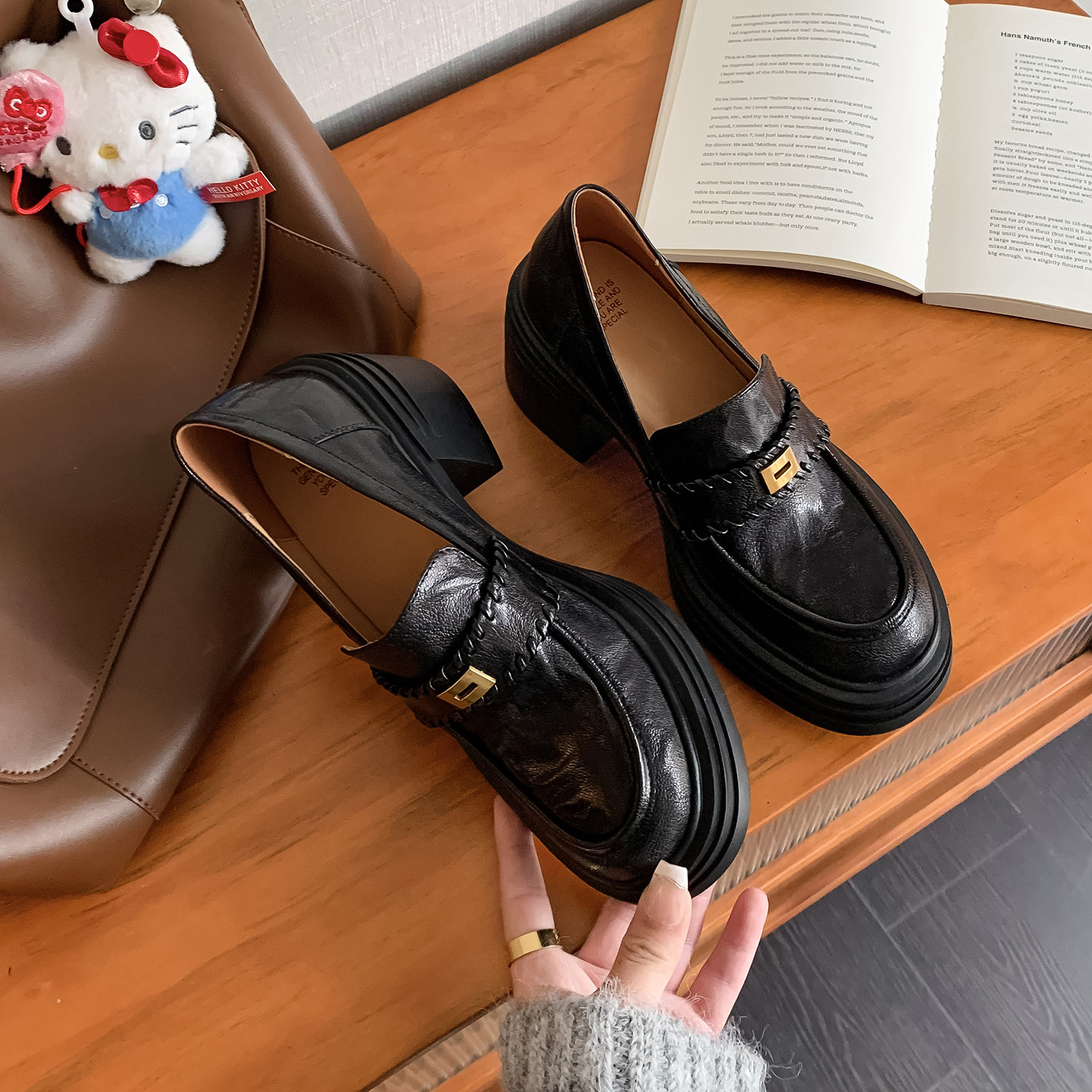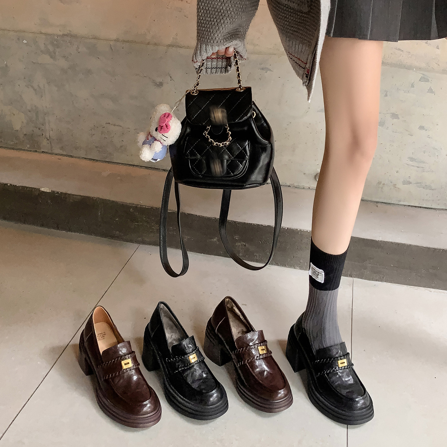 📚 pretty。穿搭Tips · 羊皮黑色高跟小皮鞋冬粗跟乐福鞋棕色单鞋女
