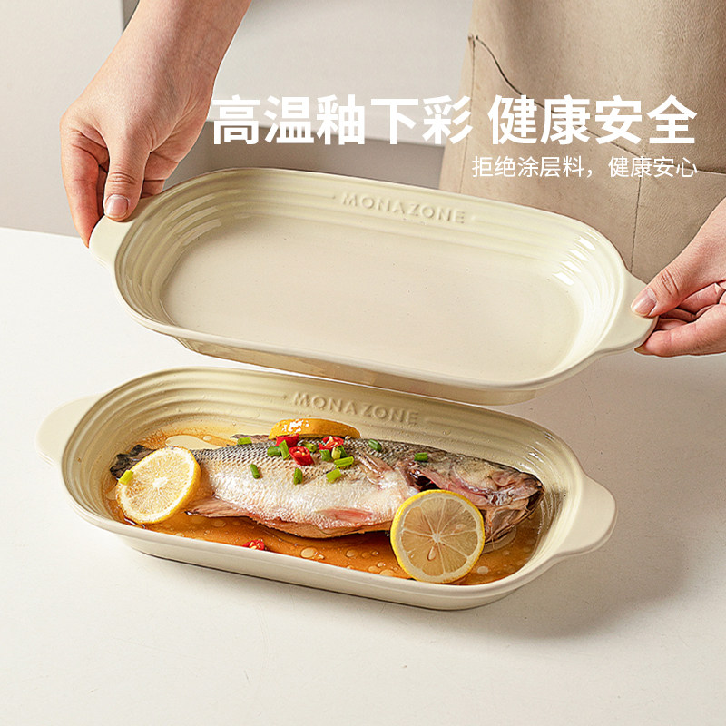 📚 摩登主妇MONAZONE鱼盘家用长方形蒸鱼专用盘子陶瓷菜盘大号早餐盘