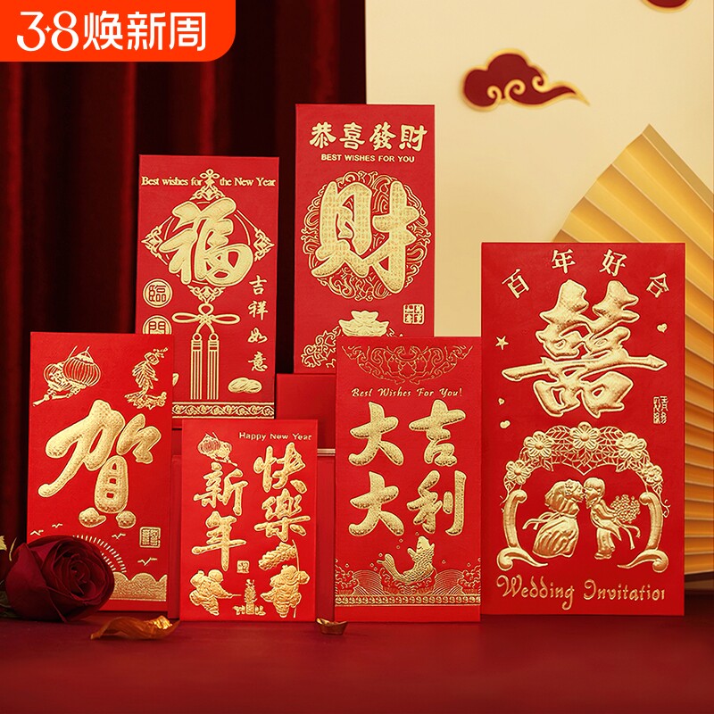 📚 结婚红包创意烫金千百元婚庆用品硬质纸大小龙凤喜字红包袋利是封