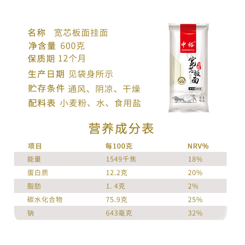 📚 中裕挂面宽芯板面600g*2宽面条凉面拌面方便速食