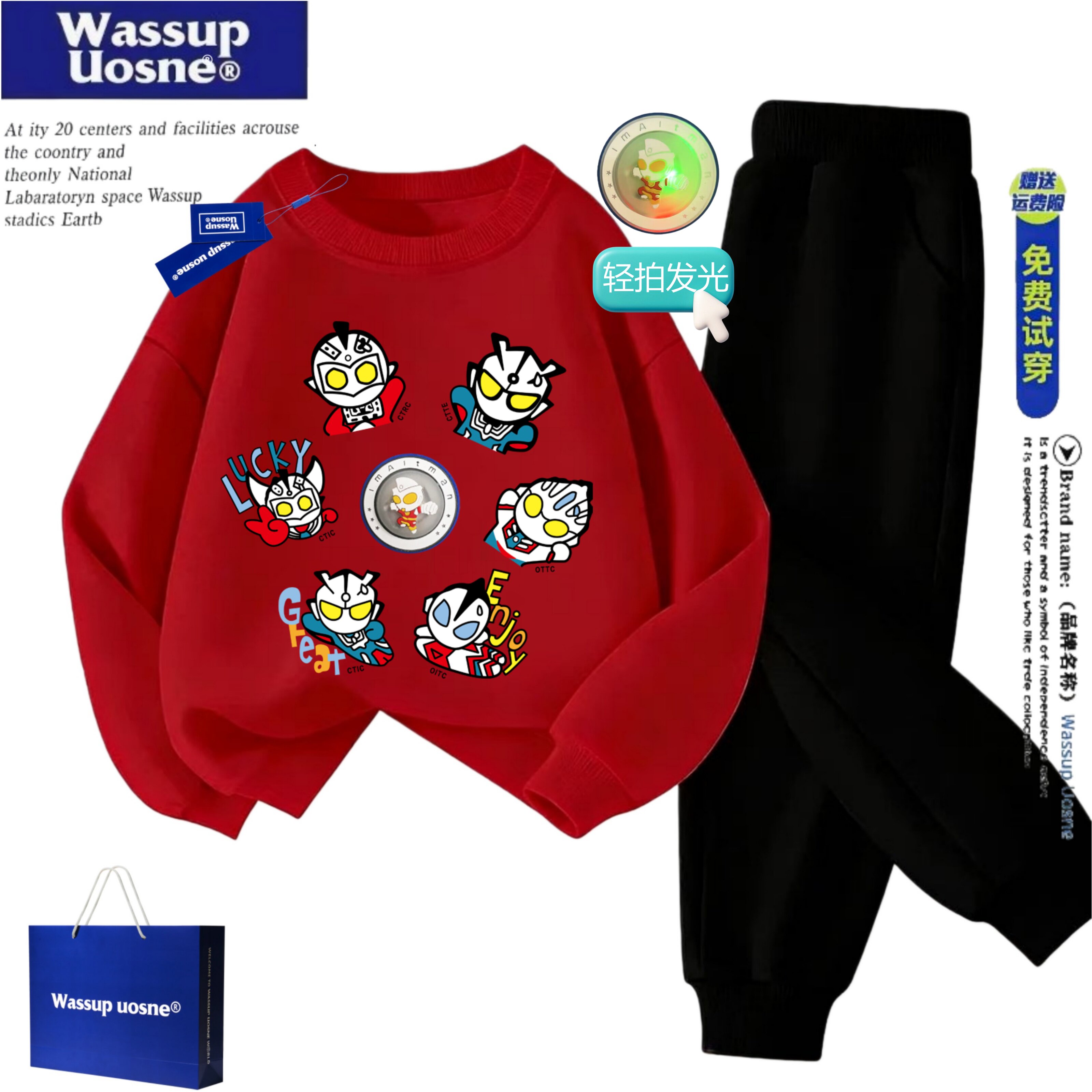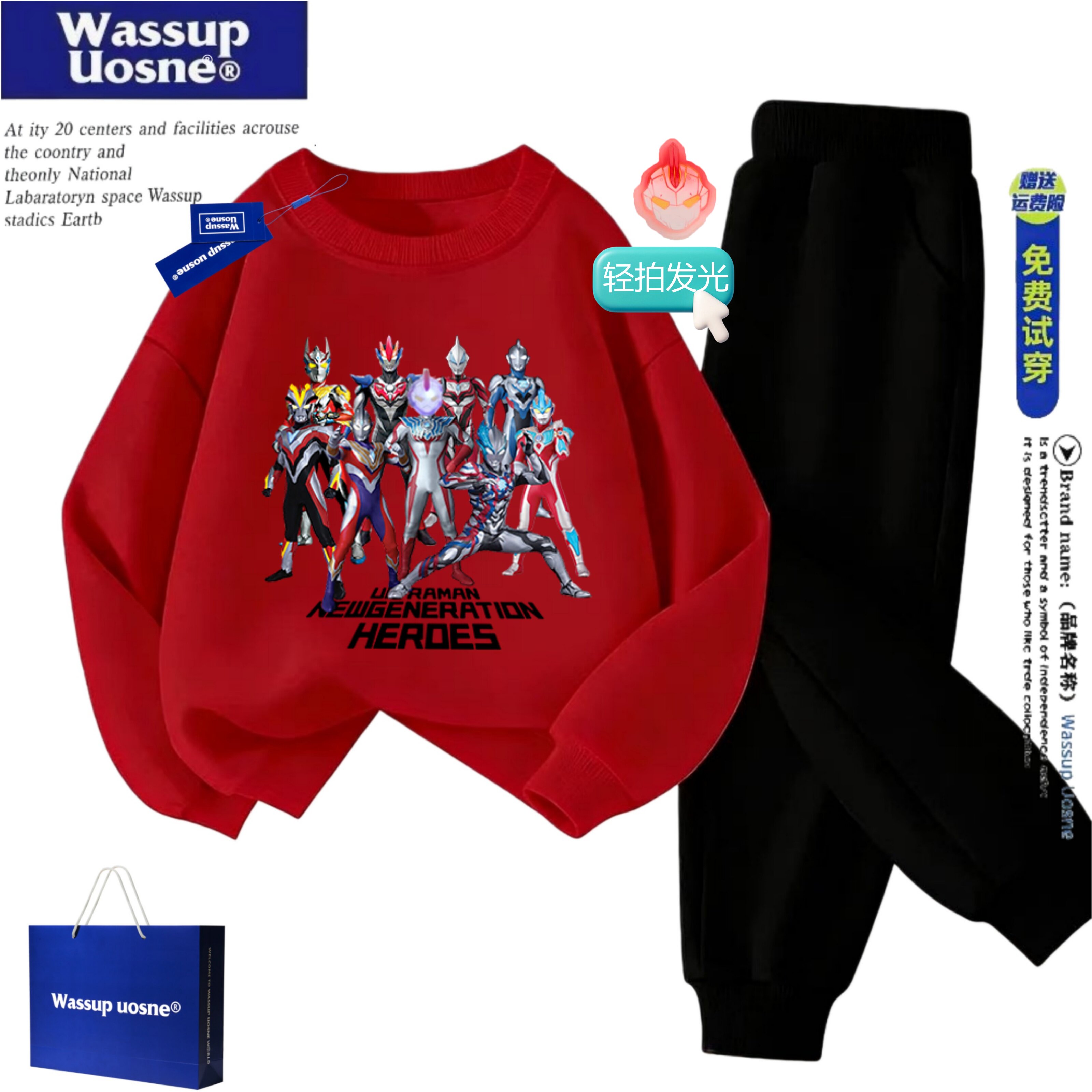 📚 WASSUP赛罗奥特曼轻拍发光加厚运动套装儿童红色卫衣喜庆两件套装