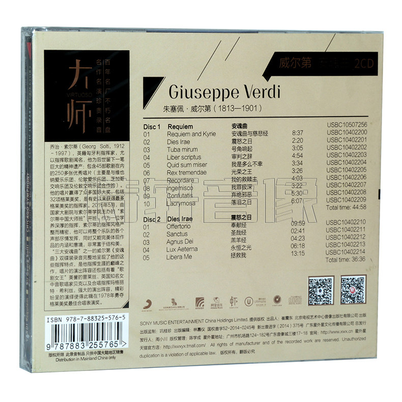 07¥ HU591 ZqipUm3NKK5¥ https://m.tb.cn/h.7EnbbtZ 正版唱片 古典音乐 大师系列 威尔第 安魂曲 专辑2CD --------------------- 【原售价】60元 【现售价】60元。