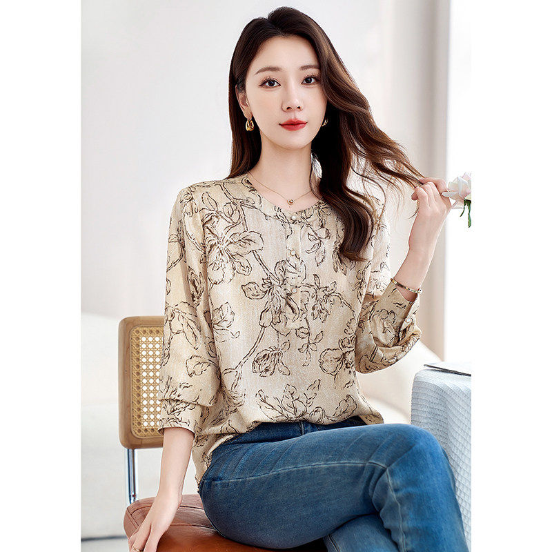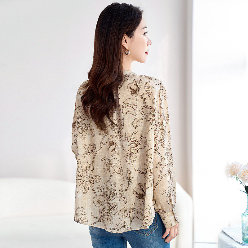 📚 水墨佳人花色宽松真丝双绉上衣女26春季长袖衬衣轻奢短款舒适小衫