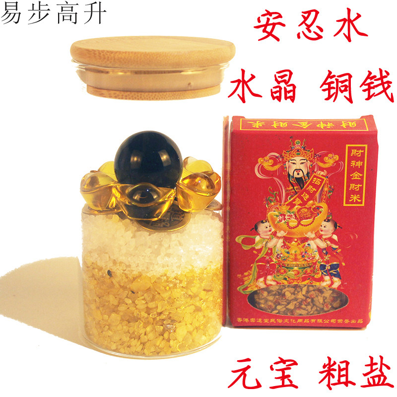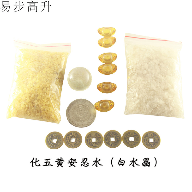 📚 安忍水黄水金白水晶黑水晶铜钱粗盐五帝钱元宝化五黄二黑装饰摆件