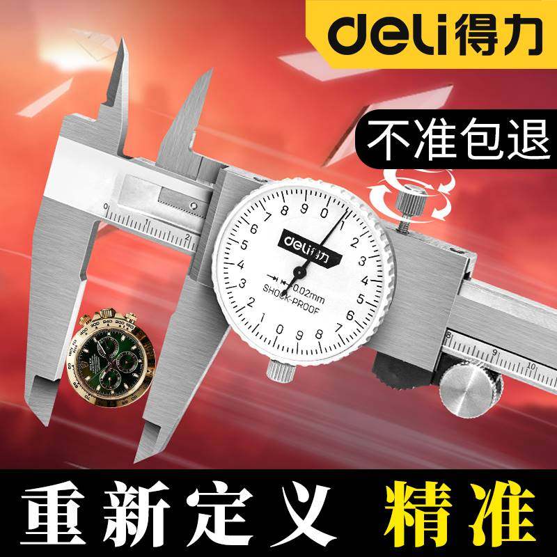 📚 得力高精度带表盘不锈钢游标卡尺防震工业级代表卡尺测量维修工具
