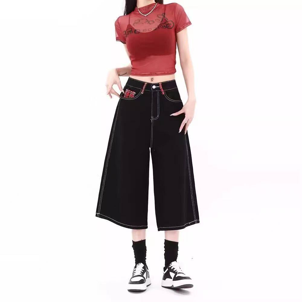 📚 美式复古水洗黑红格拼接七分牛仔裤女夏季高腰宽松垂感阔腿中裤子
