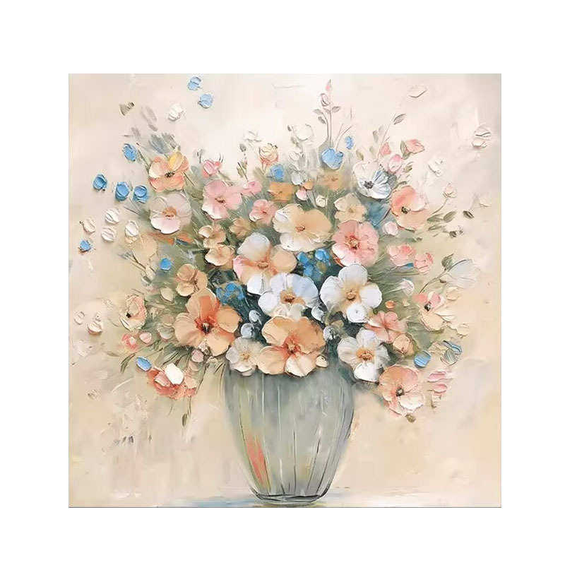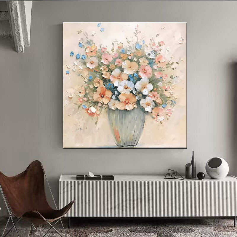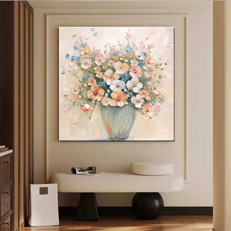 📚 纯手绘油画花卉餐厅装饰画高级正方形饭厅卧室挂画奶油风玄关壁画