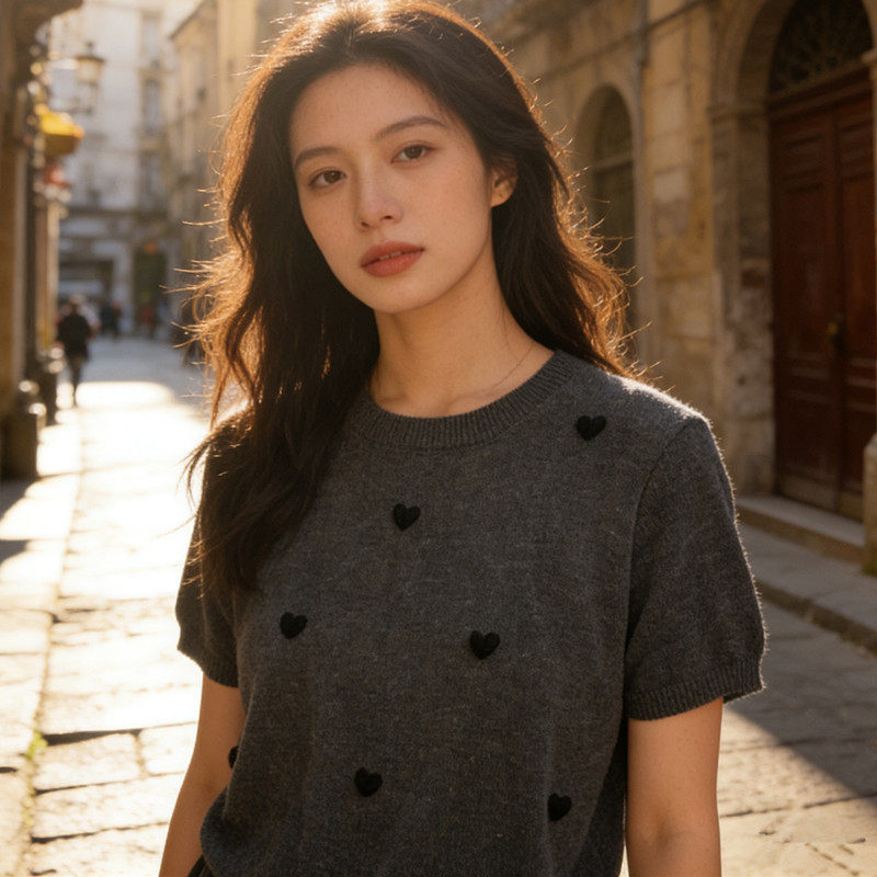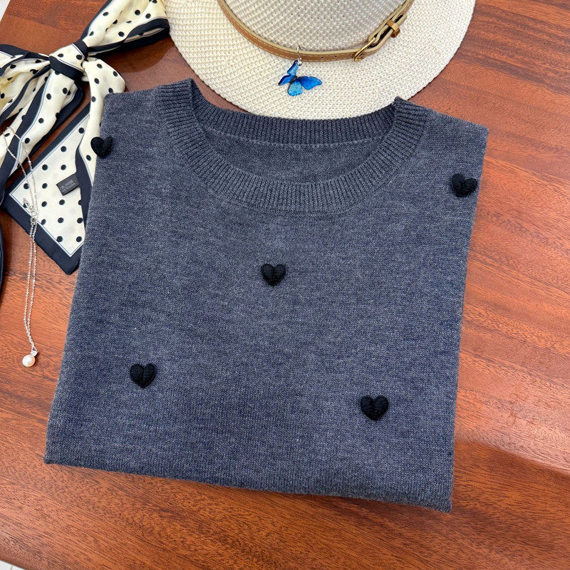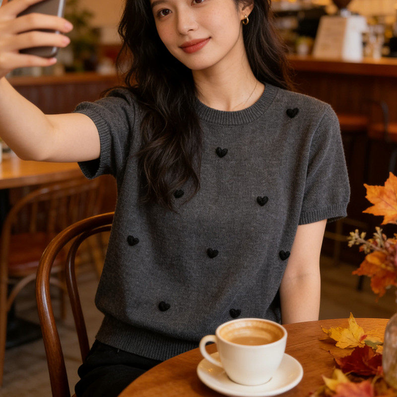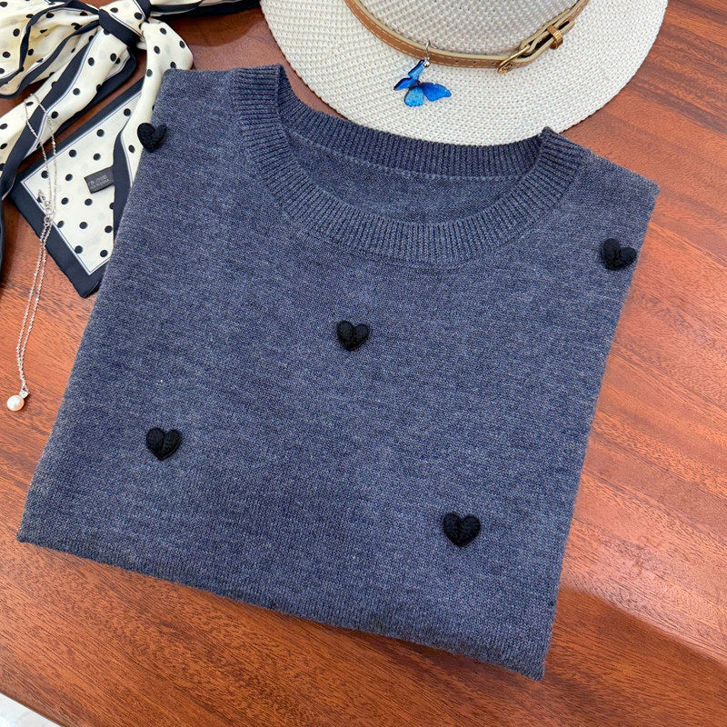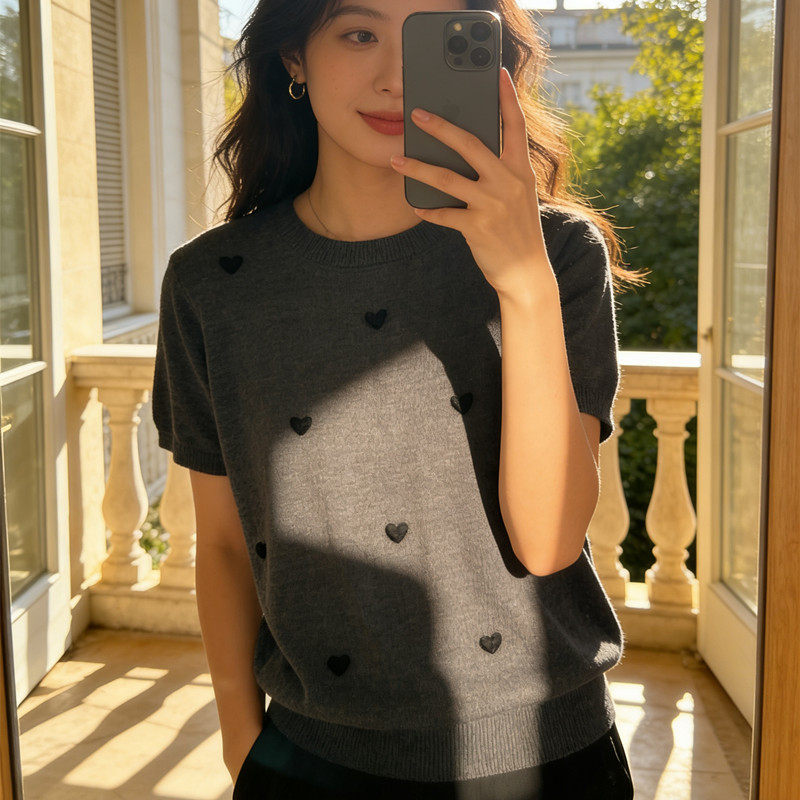 📚 【羊毛桑蚕丝】宽松上衣春夏新款圆领打底针织衫T恤短袖爱心641
