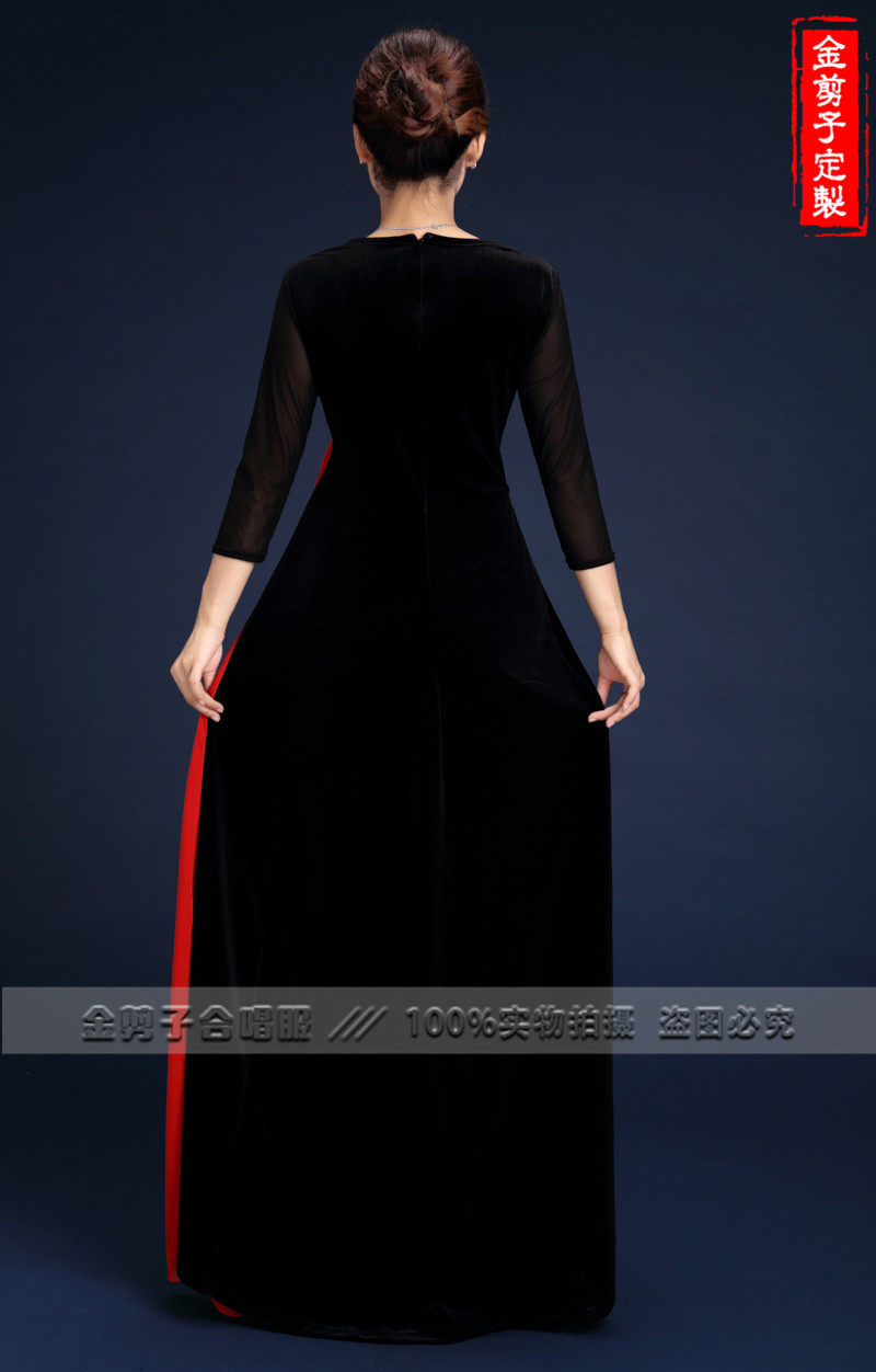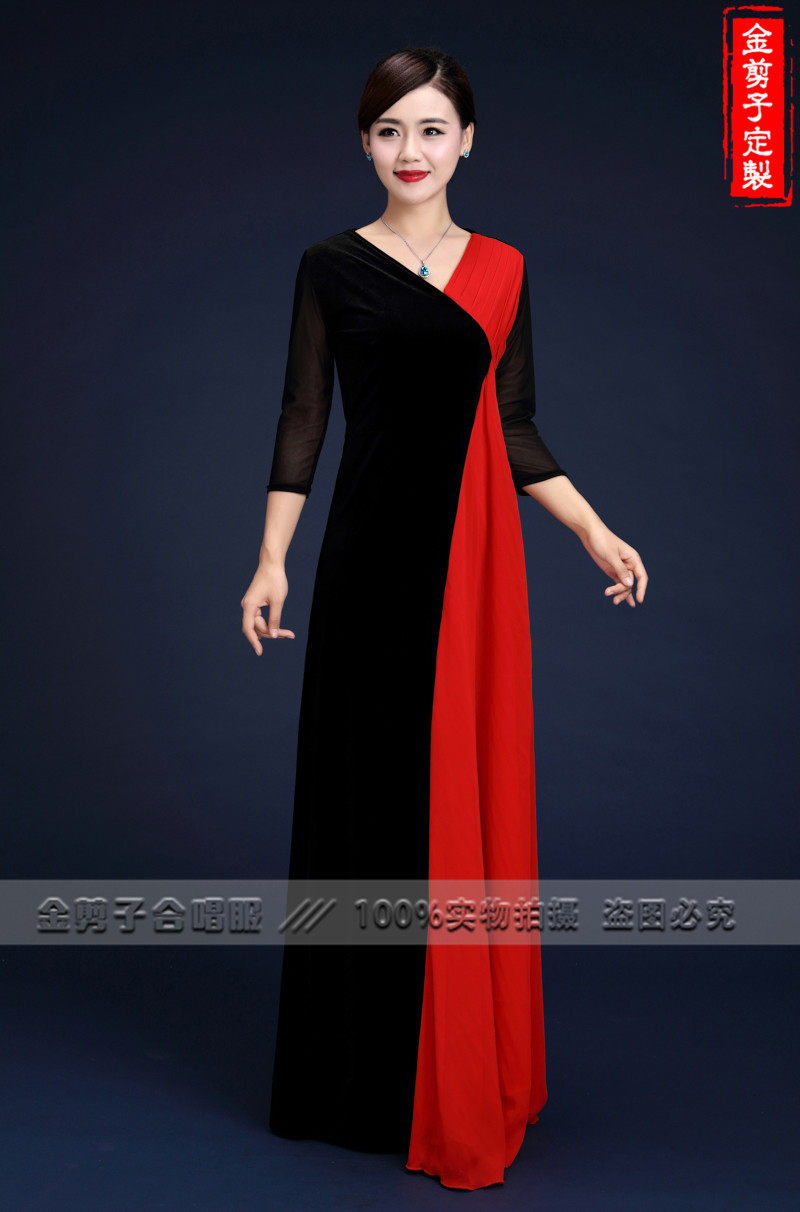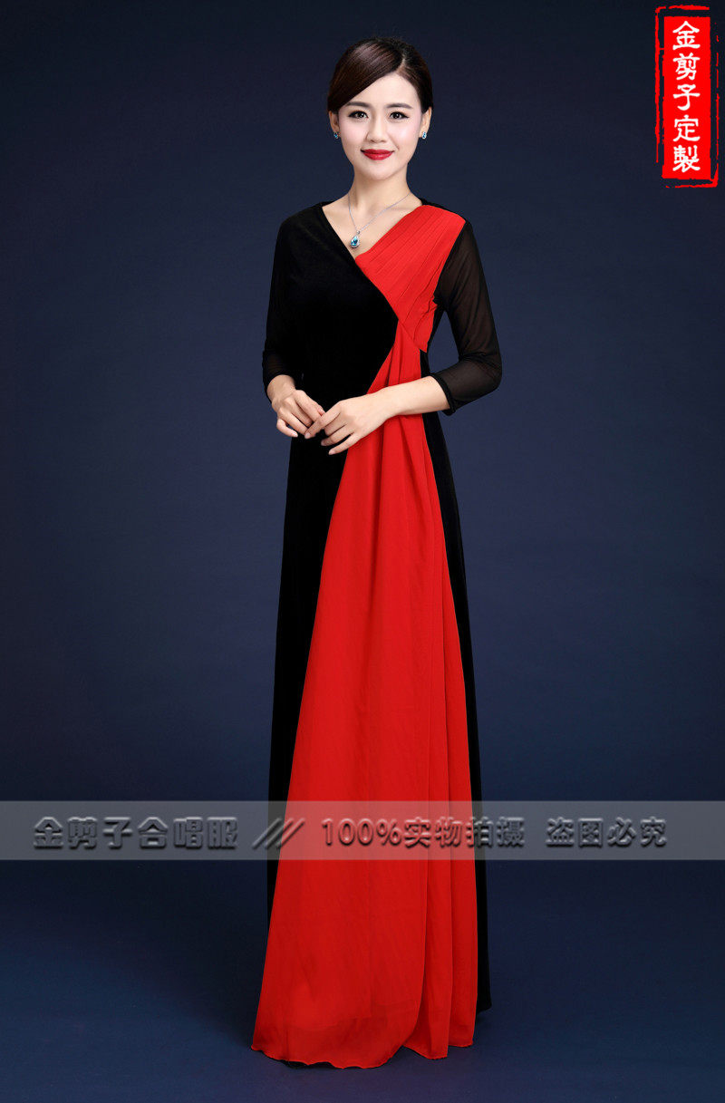 📚 大合唱演出服女士红歌黑红长裙金丝绒中老年演出服合唱可定制