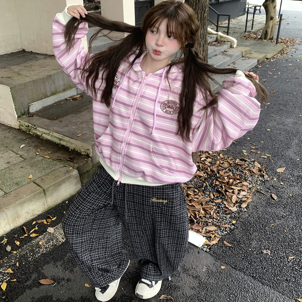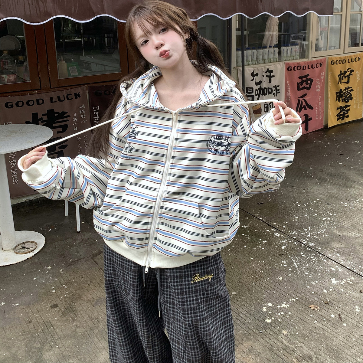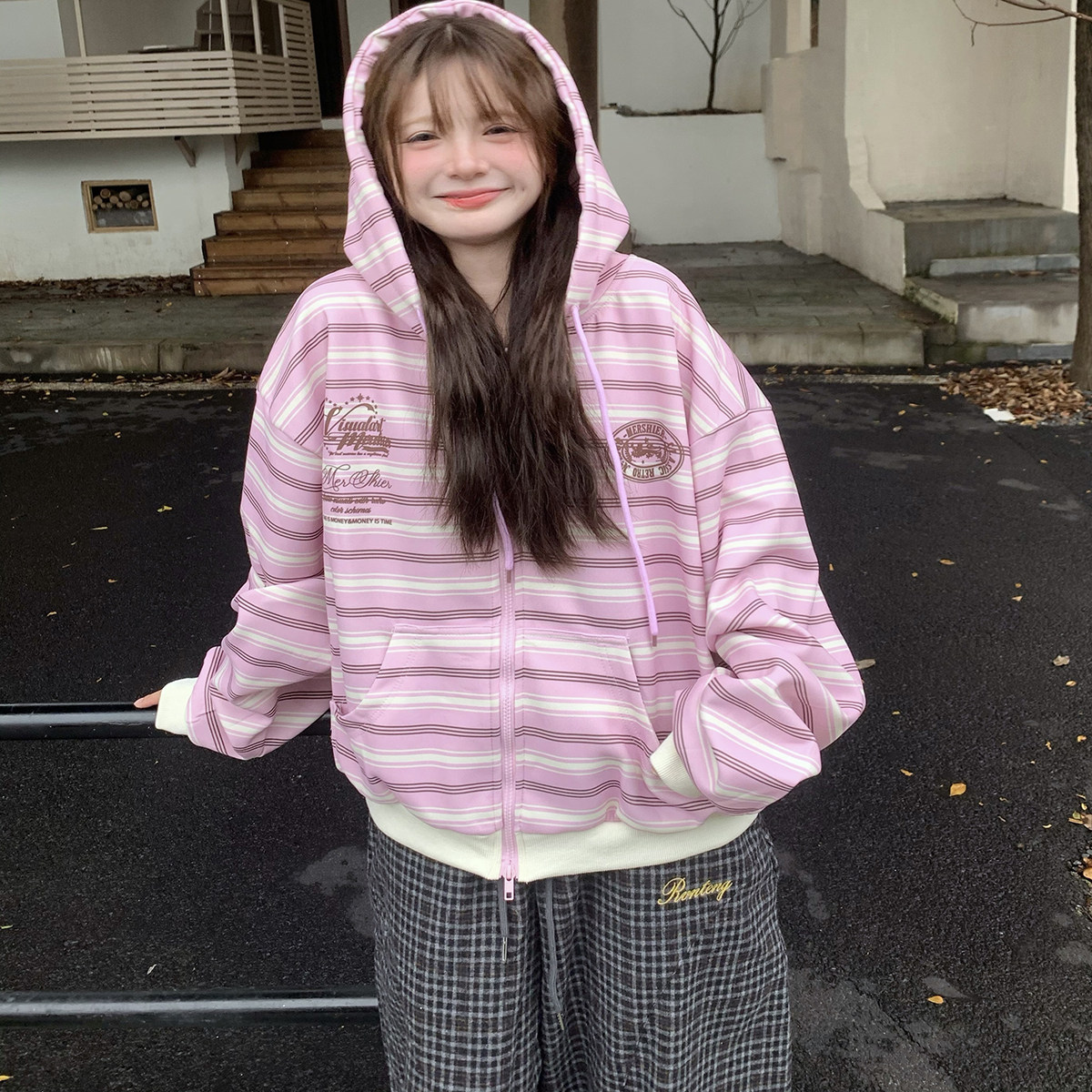 📚 GTGA撞色条纹连帽开衫卫衣女秋冬新款拉链外套慵懒风宽松休闲上衣