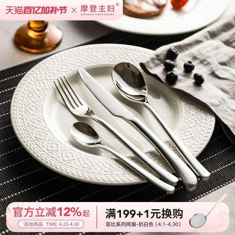 📚 摩登主妇食品级不锈钢刀叉勺三件套轻奢高级牛排餐具刀叉西餐套装