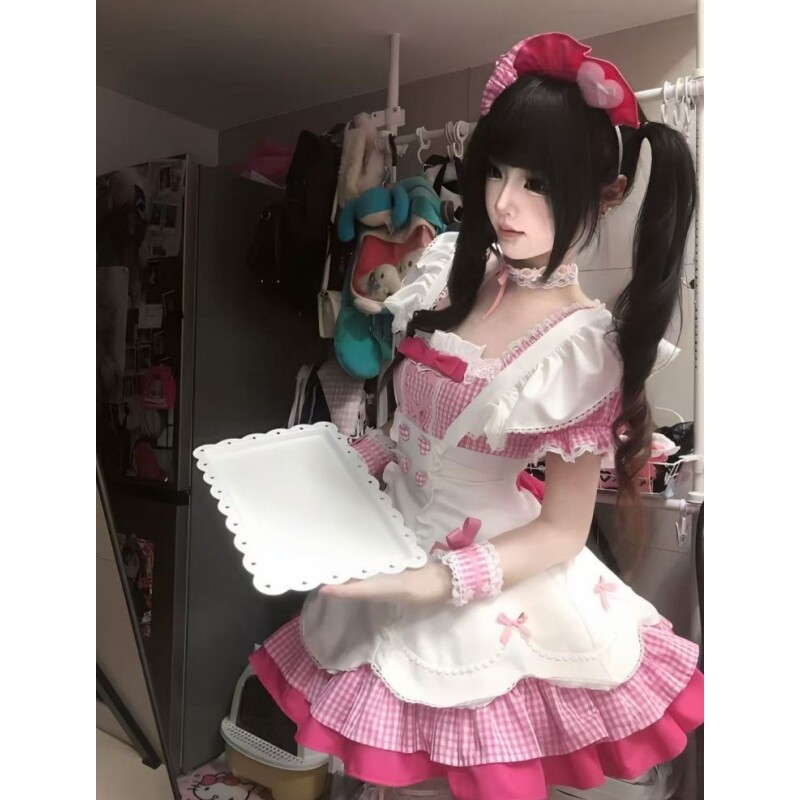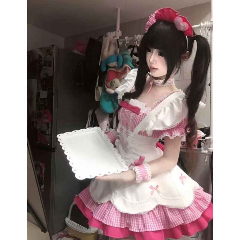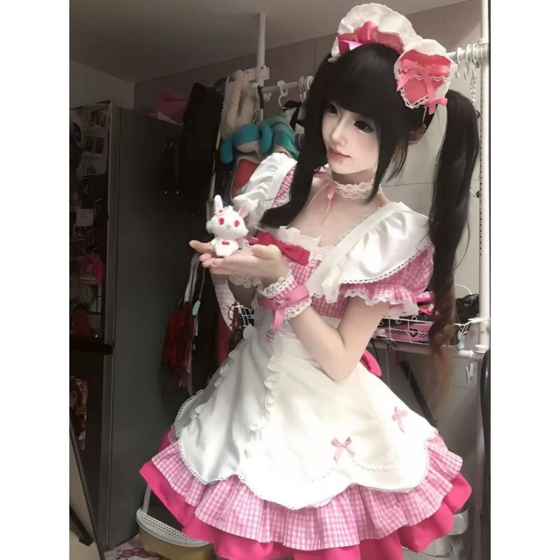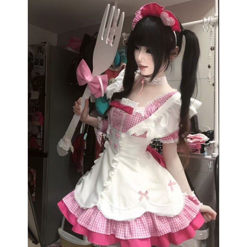 📚 日系甜美风女仆装洛丽塔Lolita裙拼接粉色格子假两件背带蓬蓬裙女