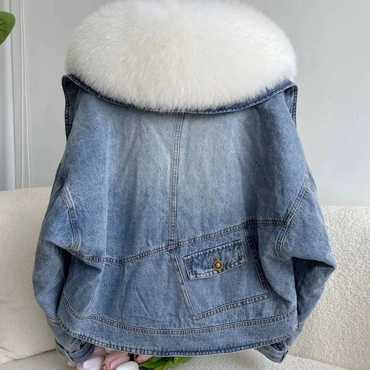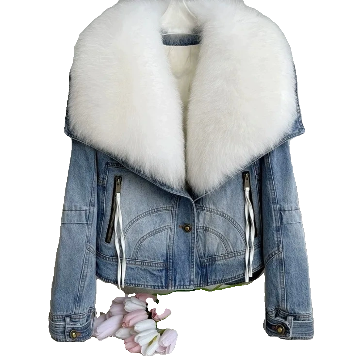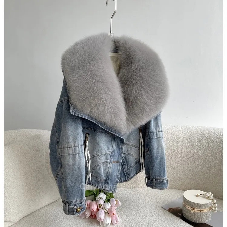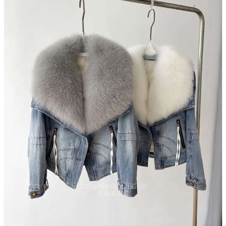 📚 真狐狸毛领新款牛仔羽绒服短款派克服女外穿加厚白鹅绒内胆可拆卸