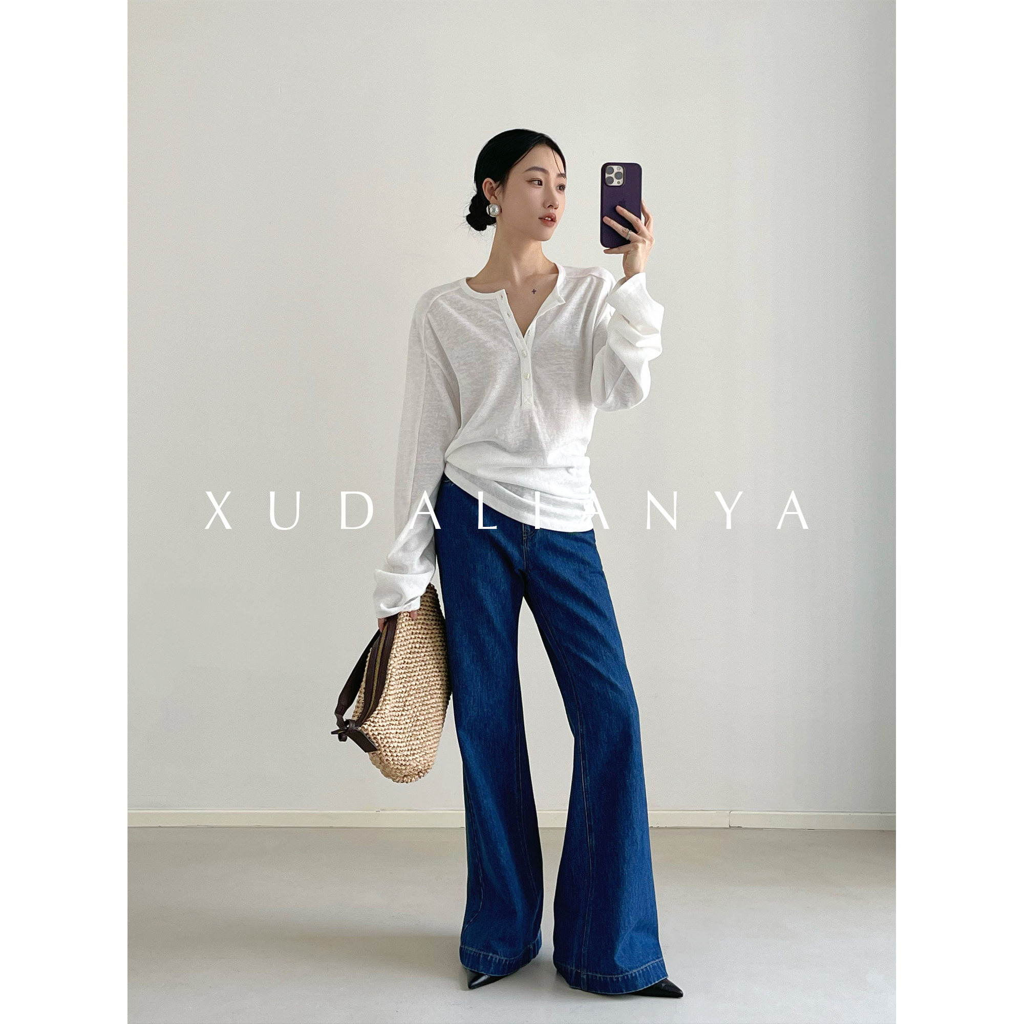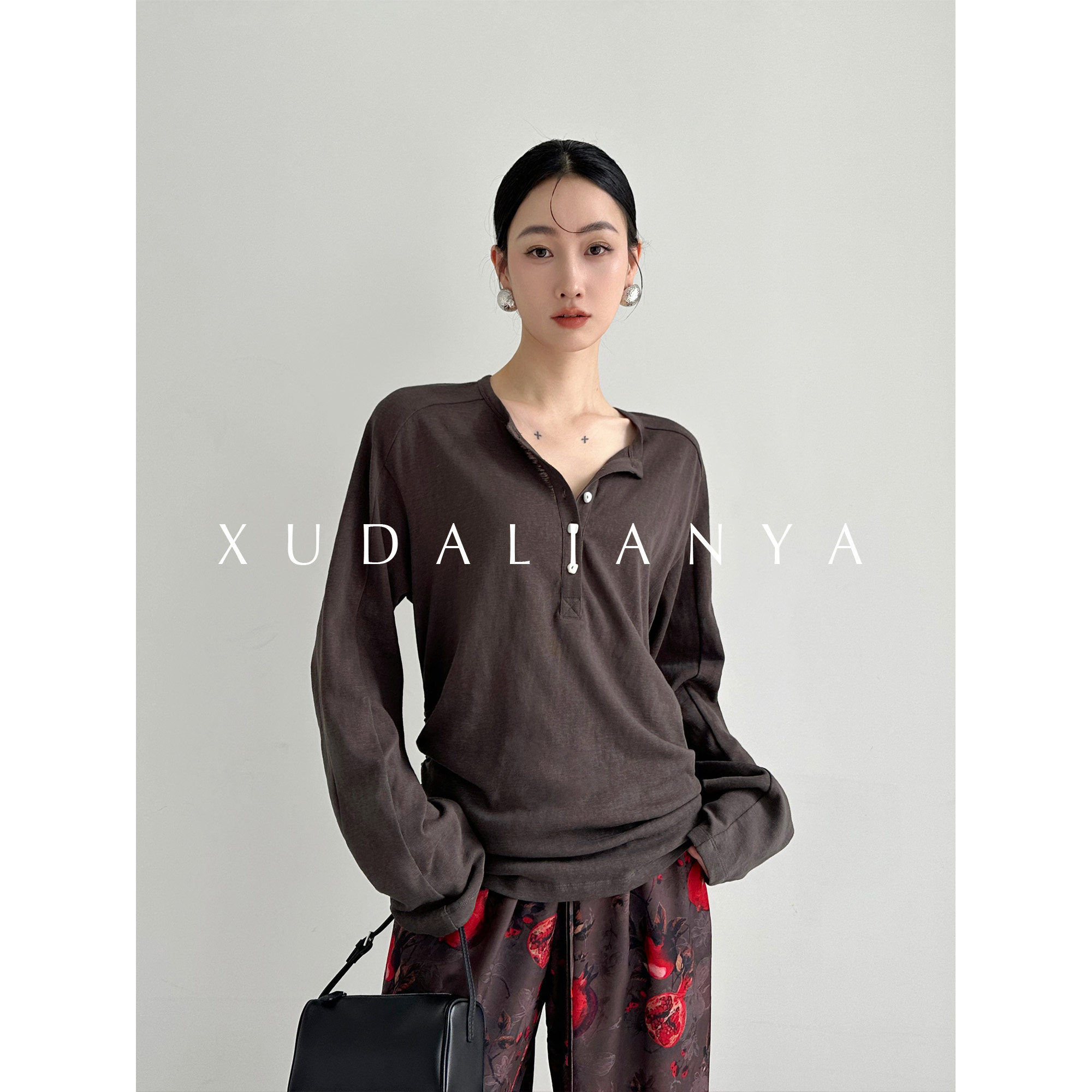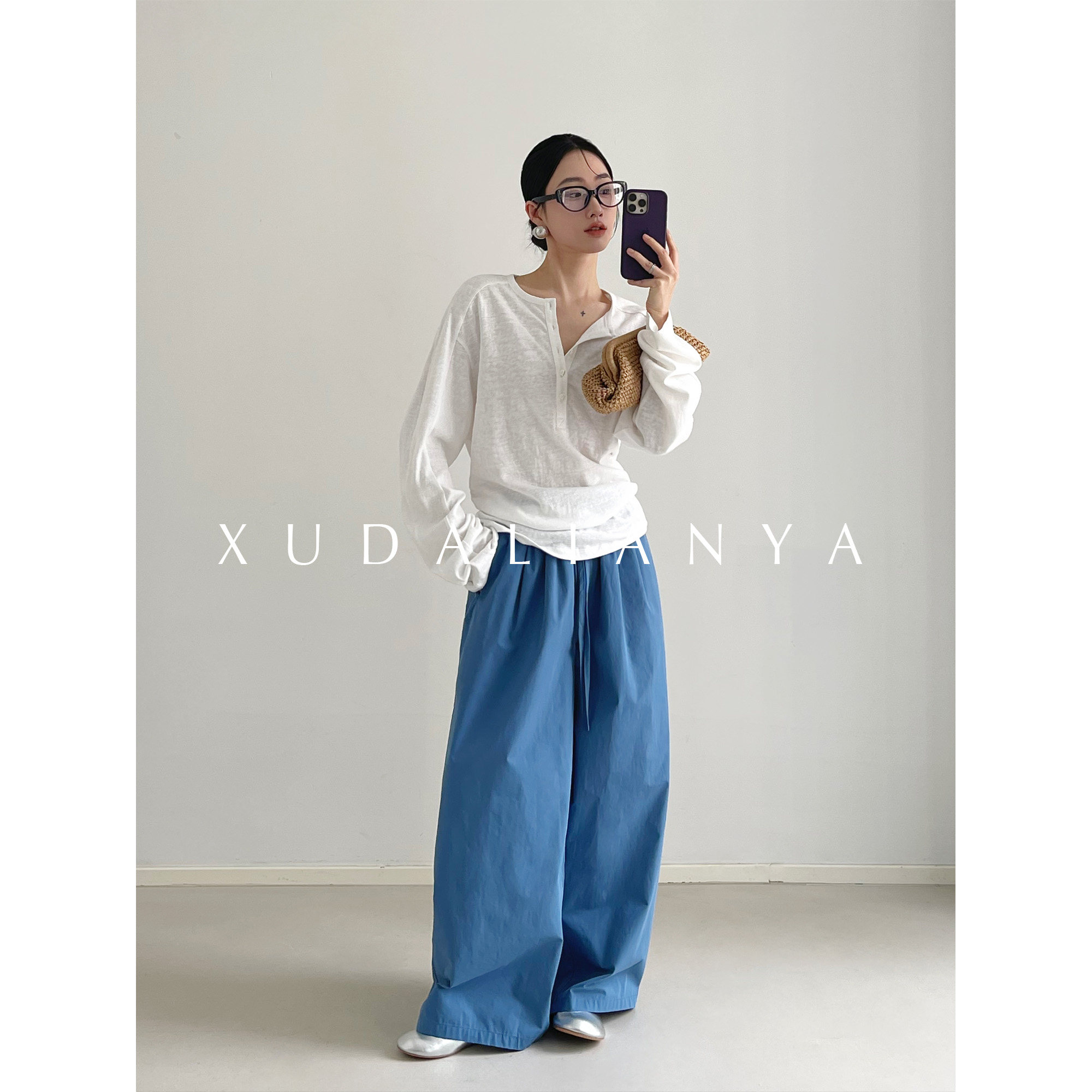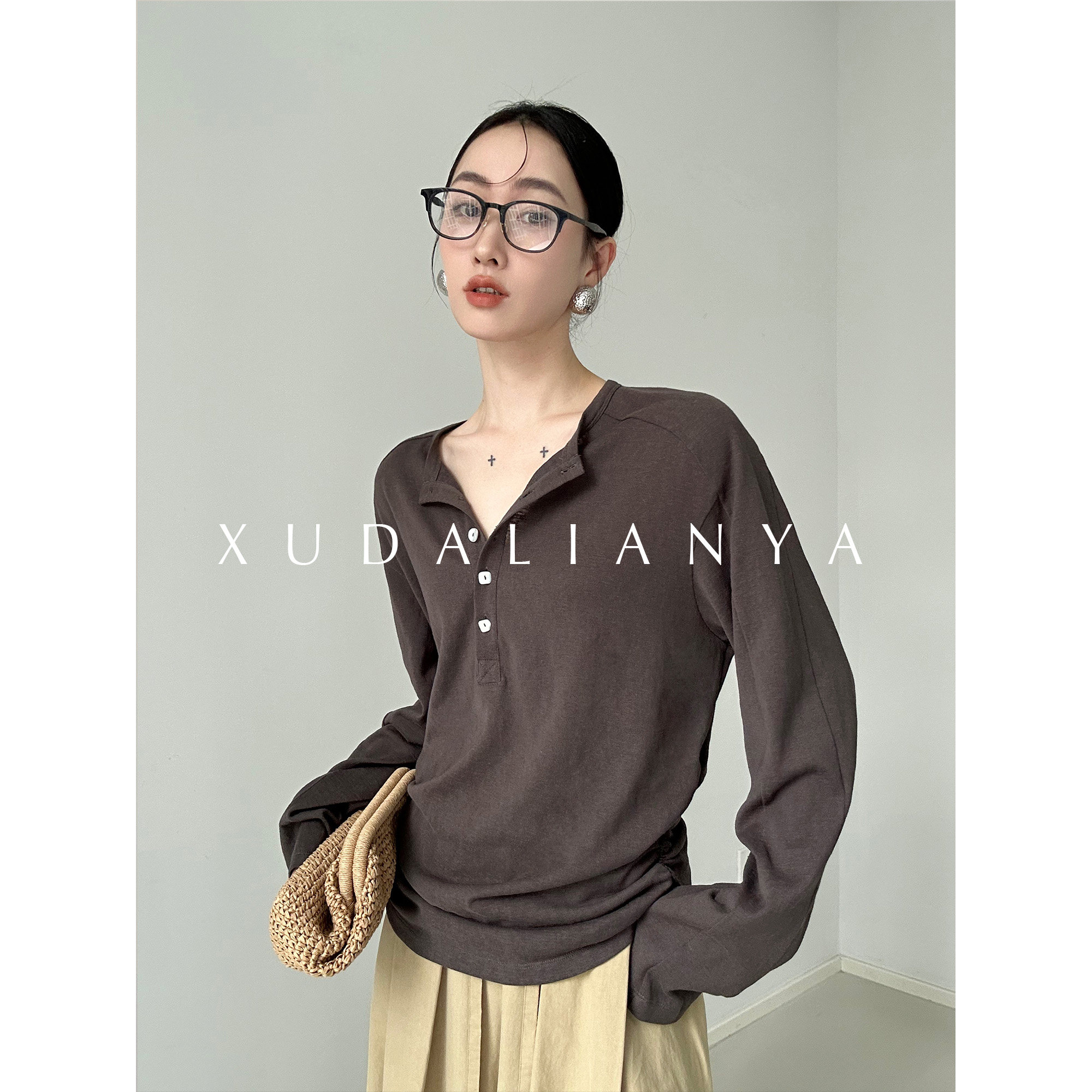 📚 徐大脸吖定制 透气松弛麻感棉长袖春褶皱收腰亨利领白色T恤女上衣