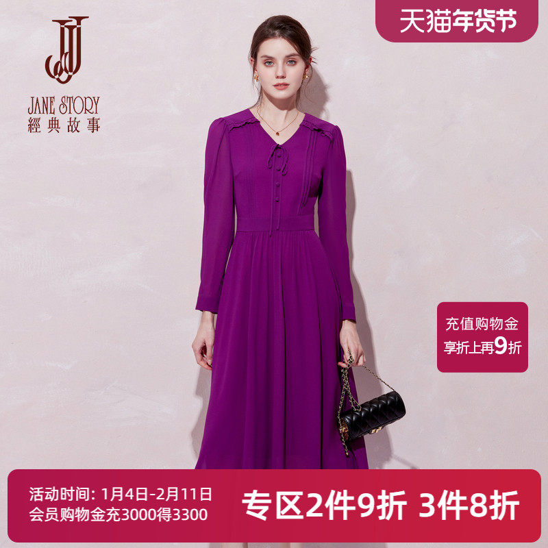 📚 2026新款春季温柔风法式紫色雪纺连衣裙女收腰知性气质V领衬衫裙