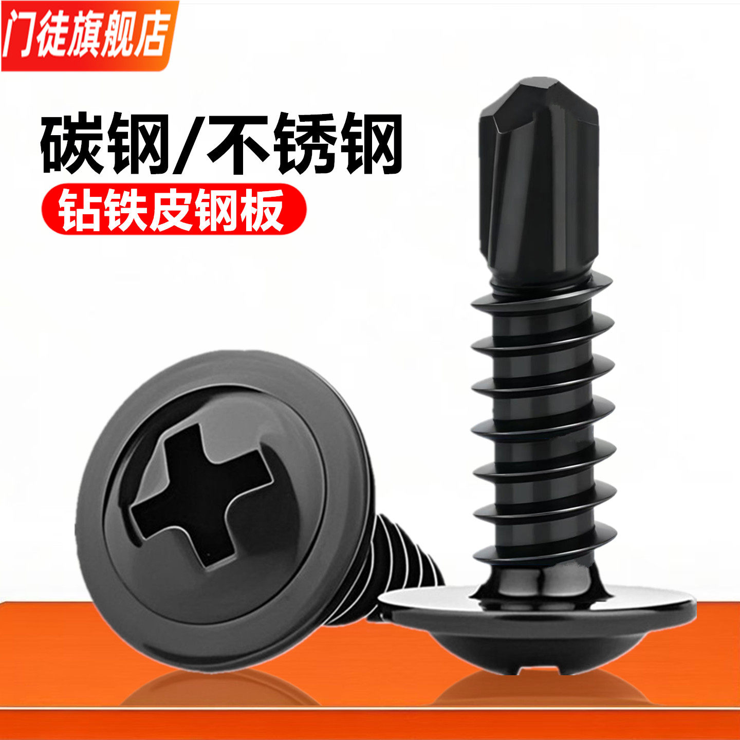 📚 黑色大扁头钻尾自攻螺丝钉不锈钢410十字圆头带垫燕尾螺丝自钻4.2